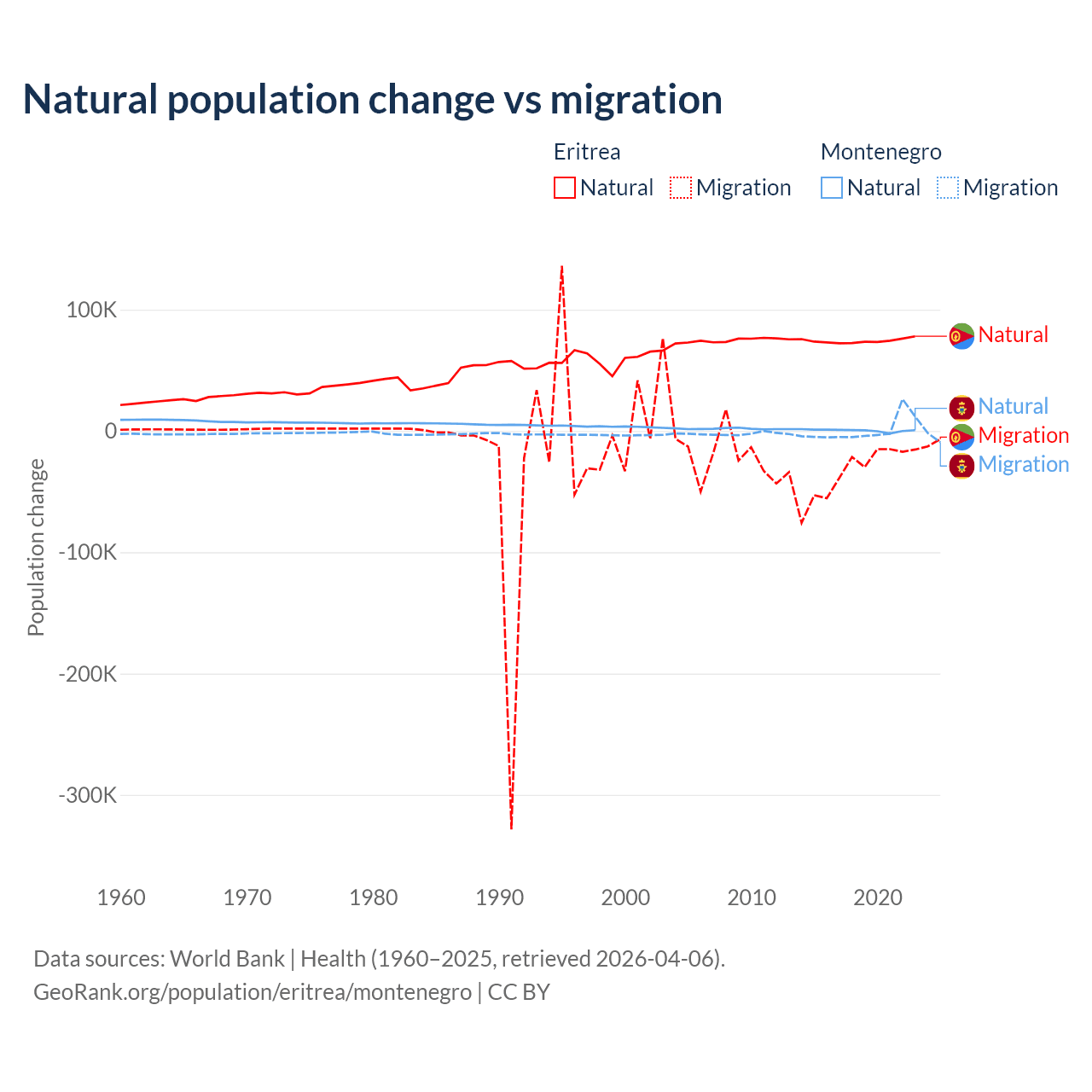 Over the last 10 years, 68.8% of the population change in Eritrea is from natural causes (a gain of 742,837 people) and 31.2% is from migration (a loss of 336,243 people). In Montenegro 52.4% is from natural causes (a gain of 4,501 people) and 47.6% is from migration (a gain of 4,095 people).