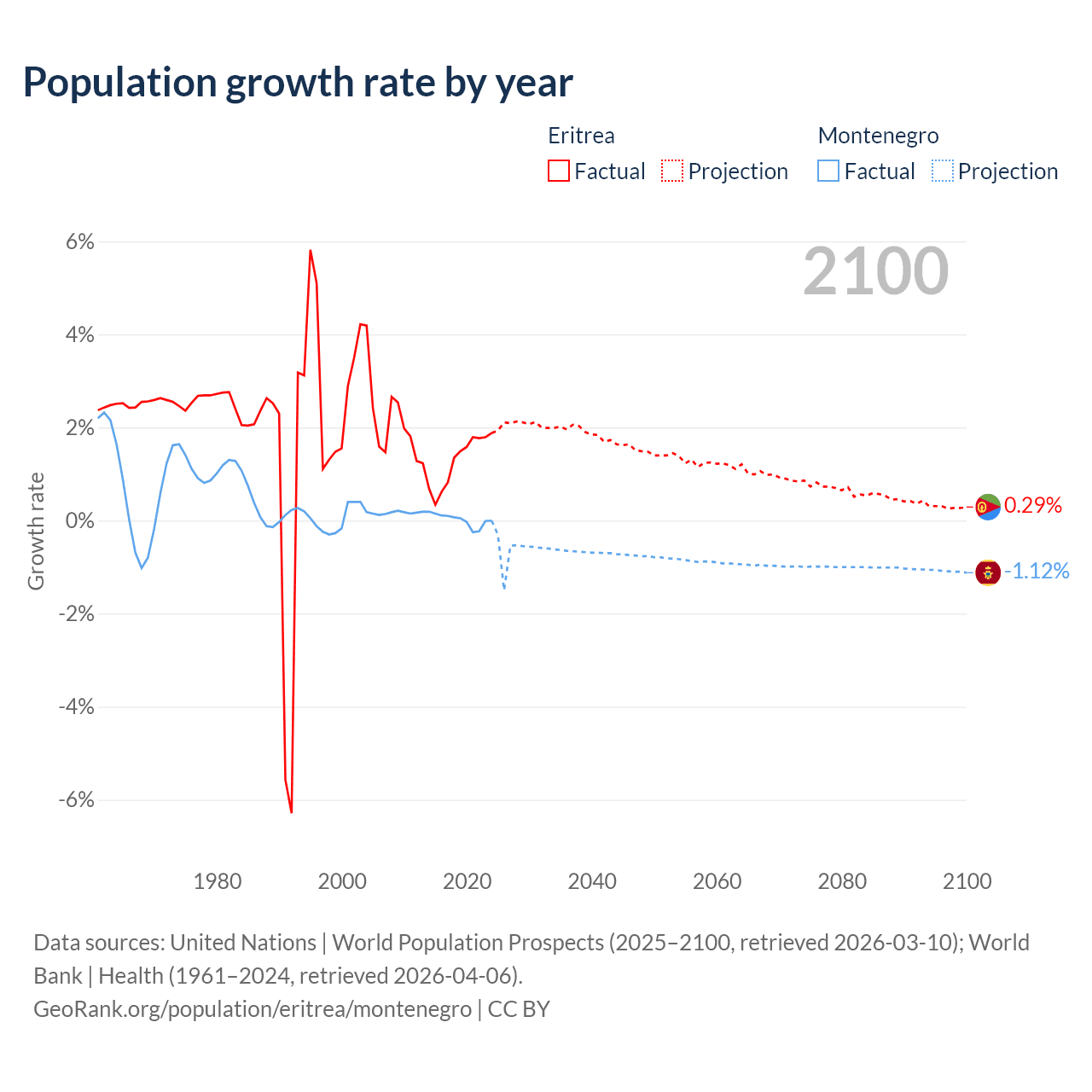 - For the last 10 years, Eritrea has had an average growth rate of +1.28% per year vs +0.01% in Montenegro.
