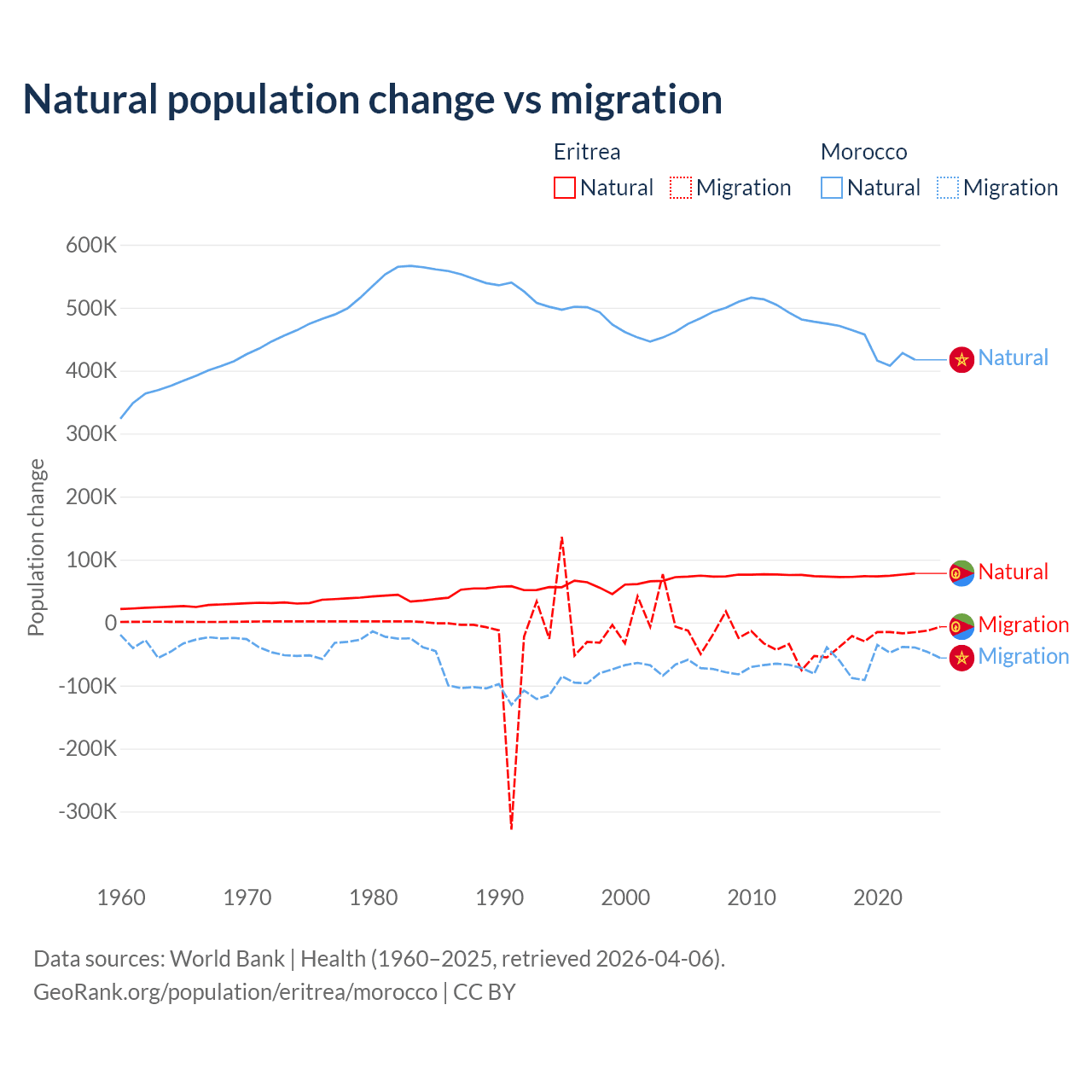 Over the last 10 years, 68.8% of the population change in Eritrea is from natural causes (a gain of 742,837 people) and 31.2% is from migration (a loss of 336,243 people). In Morocco 88.3% is from natural causes (a gain of 4,495,223 people) and 11.7% is from migration (a loss of 594,083 people).
