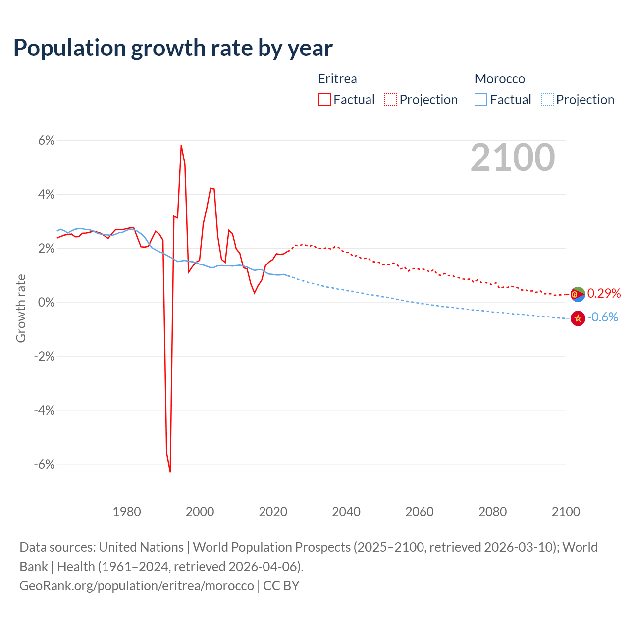 - For the last 10 years, Eritrea has had an average growth rate of +1.28% per year vs +1.09% in Morocco.