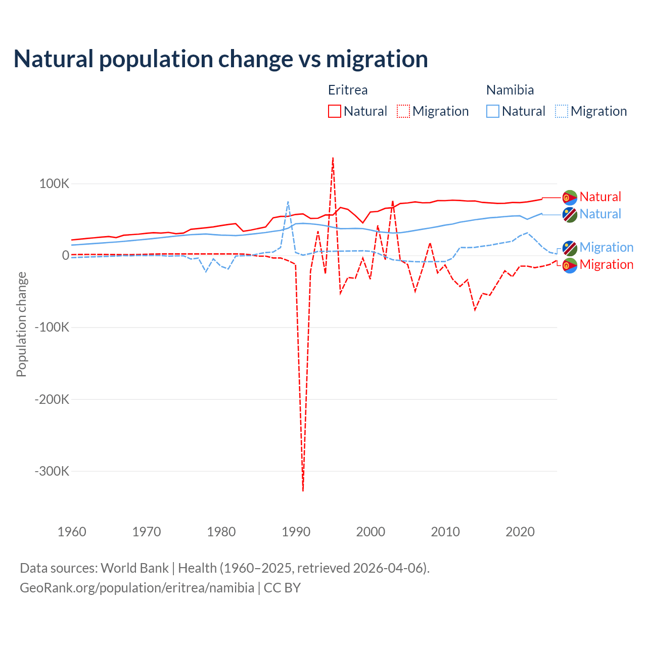 Over the last 10 years, 68.8% of the population change in Eritrea is from natural causes (a gain of 742,837 people) and 31.2% is from migration (a loss of 336,243 people). In Namibia 74.3% is from natural causes (a gain of 532,532 people) and 25.7% is from migration (a gain of 183,837 people).
