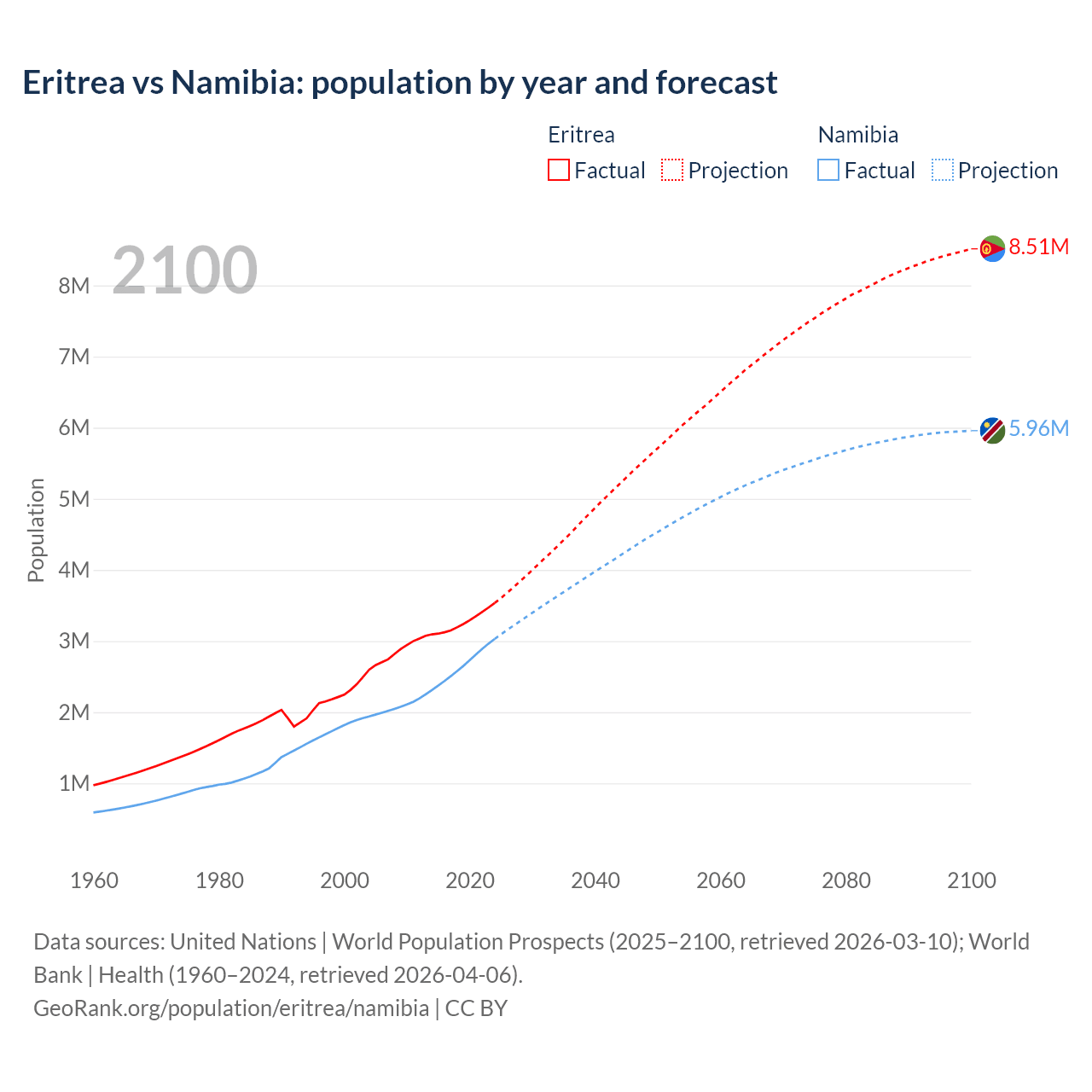 The latest officially reported population of Eritrea was 3,535,603 in 2024 vs 3,030,131 people in Namibia in 2024. In 2026, based on the adjusted UN estimation, the current Eritrea's population is 3,700,586 people compared to 3,173,089 in Namibia.
