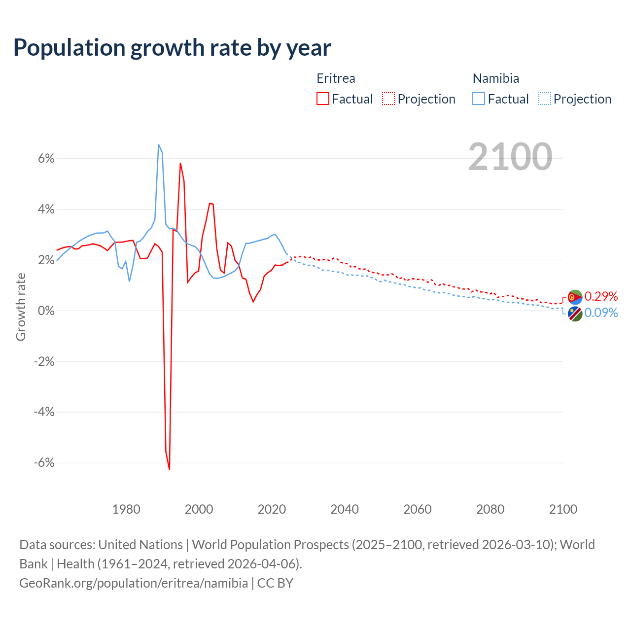 - For the last 10 years, Eritrea has had an average growth rate of +1.28% per year vs +2.73% in Namibia.