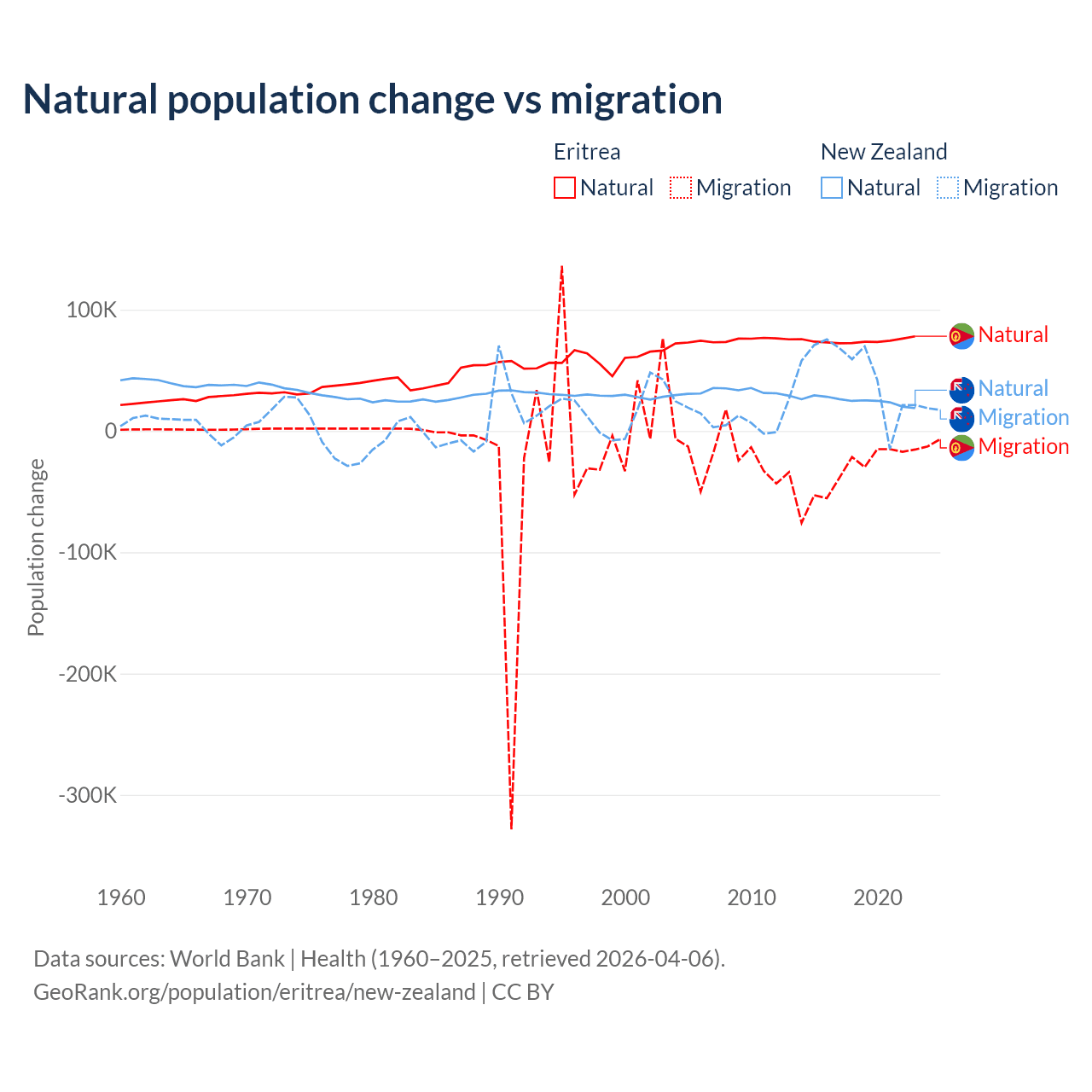 Over the last 10 years, 68.8% of the population change in Eritrea is from natural causes (a gain of 742,837 people) and 31.2% is from migration (a loss of 336,243 people). In New Zealand 34.4% is from natural causes (a gain of 247,767 people) and 65.6% is from migration (a gain of 471,602 people).