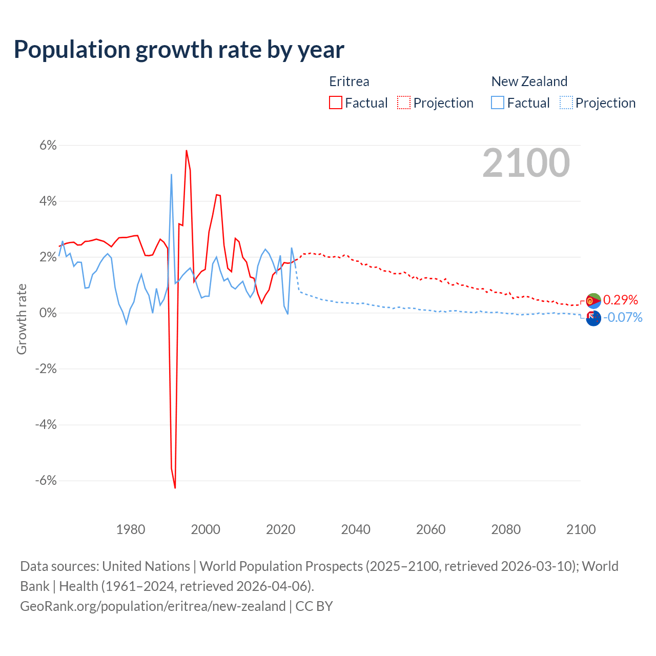 - For the last 10 years, Eritrea has had an average growth rate of +1.28% per year vs +1.6% in New Zealand.