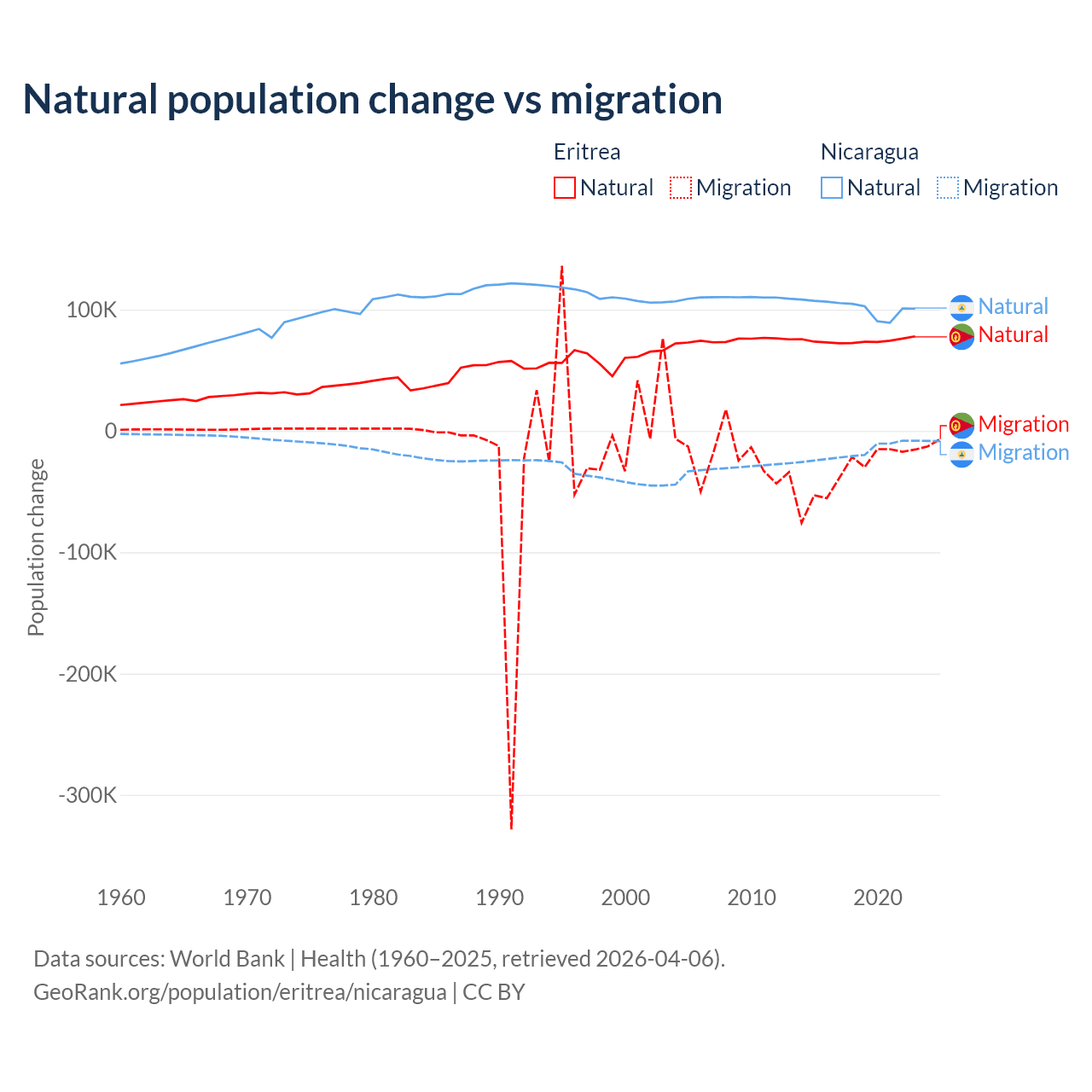 Over the last 10 years, 68.8% of the population change in Eritrea is from natural causes (a gain of 742,837 people) and 31.2% is from migration (a loss of 336,243 people). In Nicaragua 85.5% is from natural causes (a gain of 1,017,084 people) and 14.5% is from migration (a loss of 172,078 people).