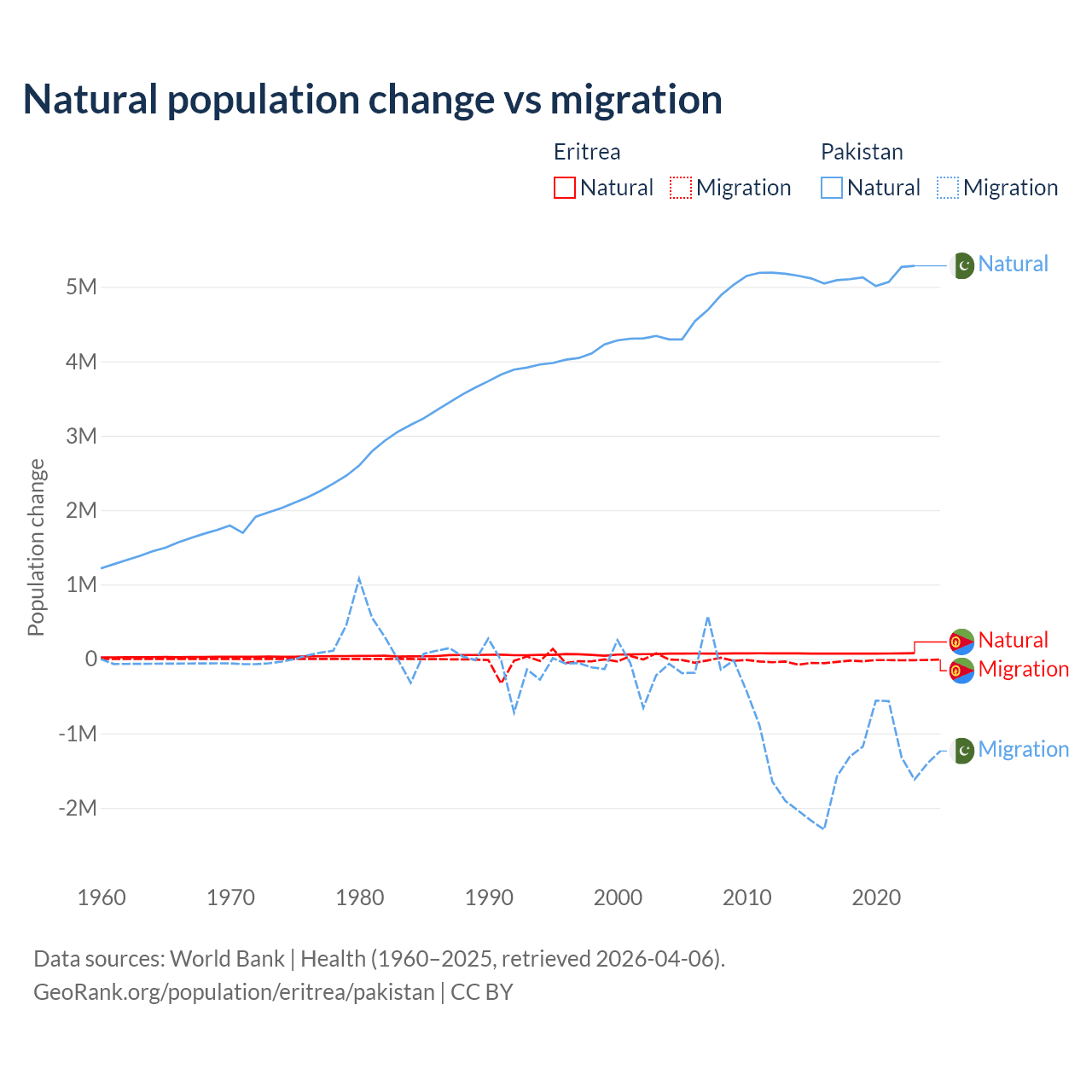 Over the last 10 years, 68.8% of the population change in Eritrea is from natural causes (a gain of 742,837 people) and 31.2% is from migration (a loss of 336,243 people). In Pakistan 77.8% is from natural causes (a gain of 51,255,404 people) and 22.2% is from migration (a loss of 14,629,055 people).