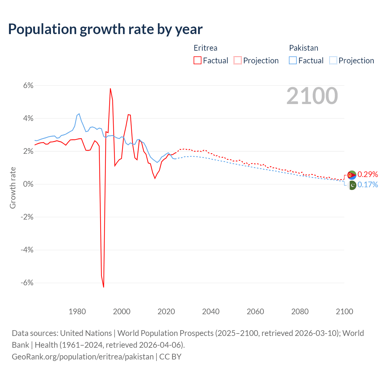 - For the last 10 years, Eritrea has had an average growth rate of +1.28% per year vs +1.6% in Pakistan.