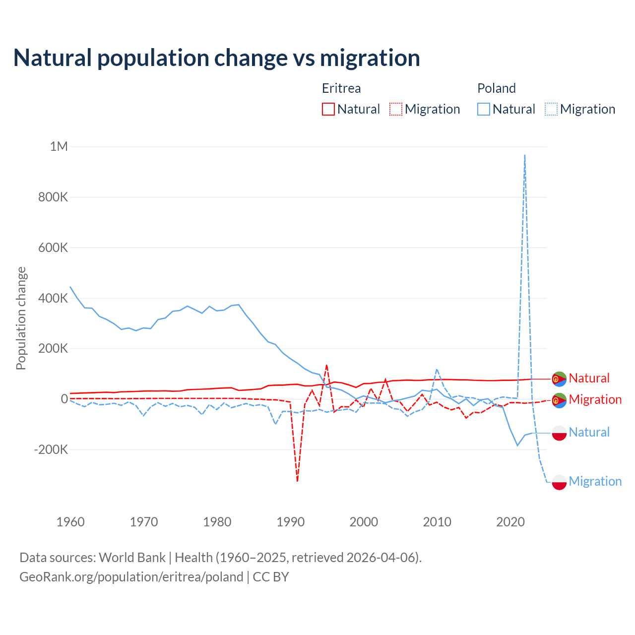 Over the last 10 years, 68.8% of the population change in Eritrea is from natural causes (a gain of 742,837 people) and 31.2% is from migration (a loss of 336,243 people). In Poland 41.4% is from natural causes (a loss of 675,443 people) and 58.6% is from migration (a gain of 955,766 people).