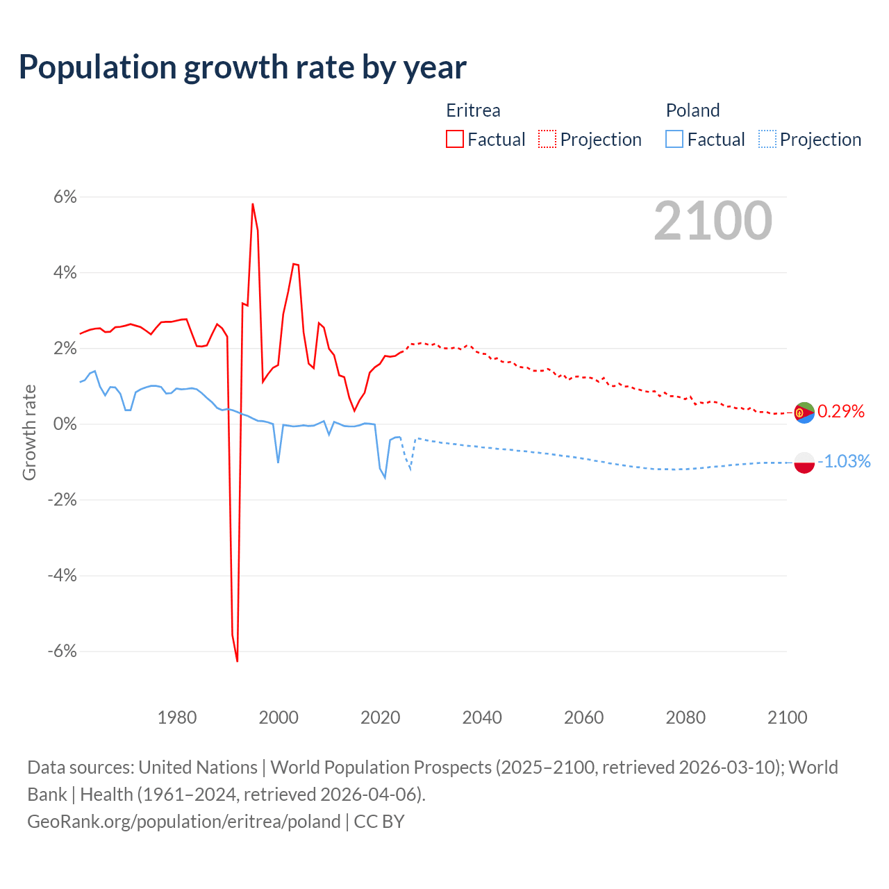 - For the last 10 years, Eritrea has had an average growth rate of +1.28% per year vs -0.36% in Poland.