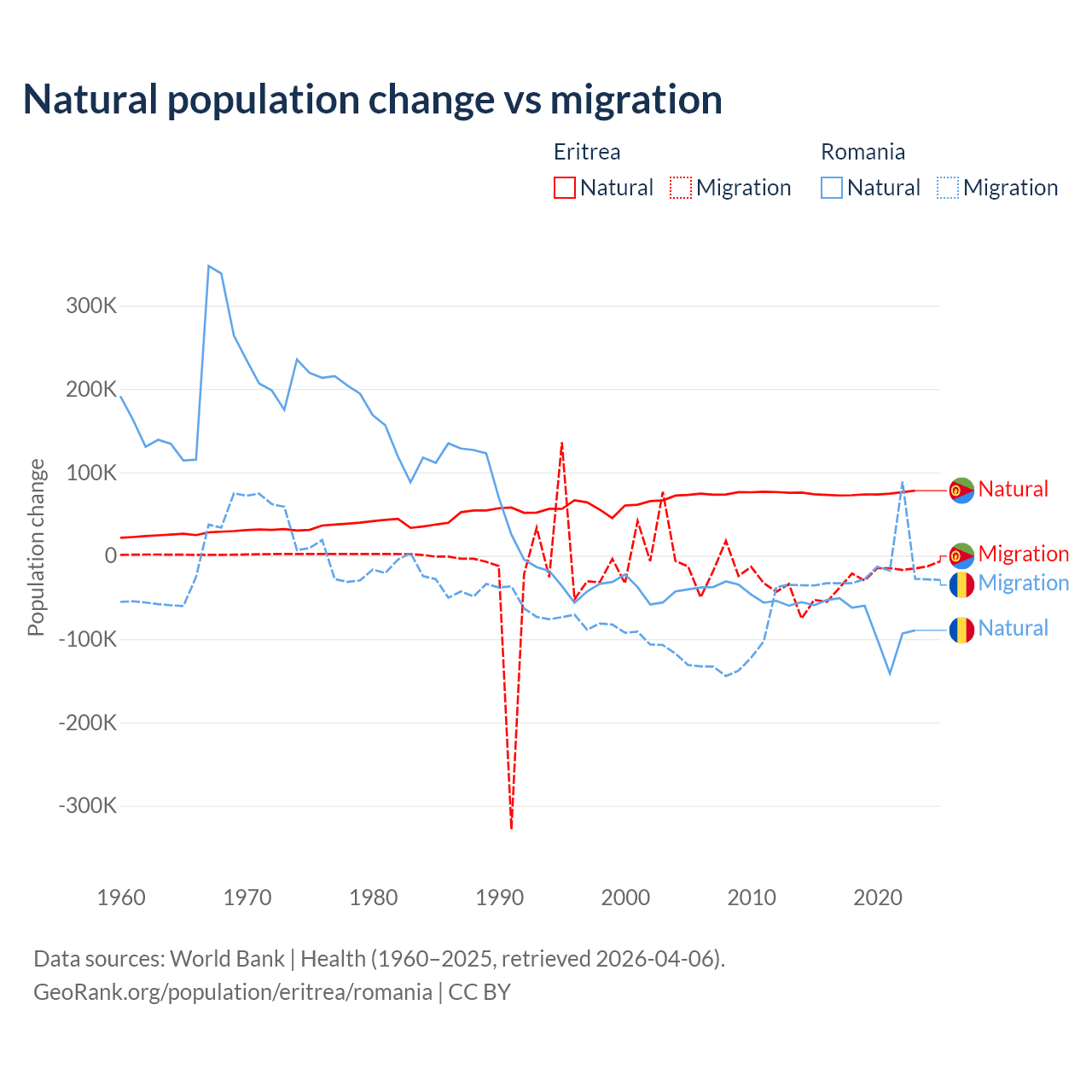 Over the last 10 years, 68.8% of the population change in Eritrea is from natural causes (a gain of 742,837 people) and 31.2% is from migration (a loss of 336,243 people). In Romania 82% is from natural causes (a loss of 766,295 people) and 18% is from migration (a loss of 167,917 people).