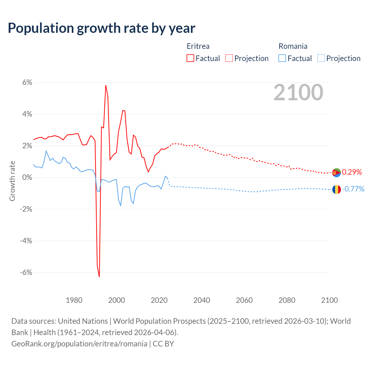 - For the last 10 years, Eritrea has had an average growth rate of +1.28% per year vs -0.43% in Romania.