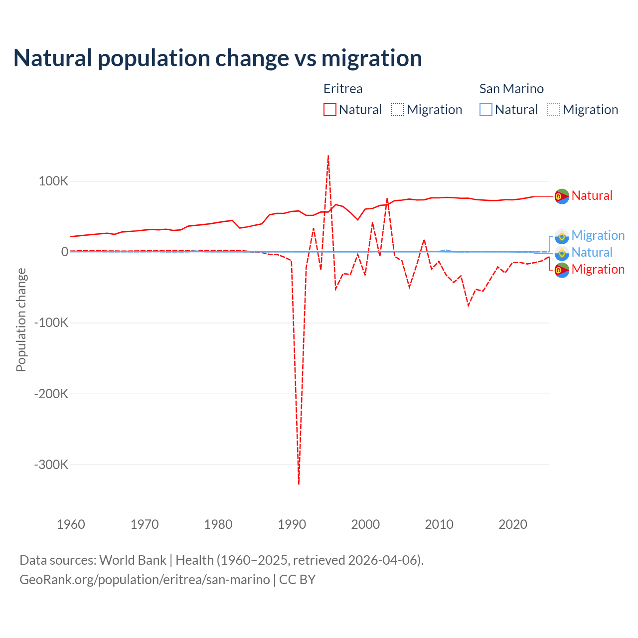 Over the last 10 years, 68.8% of the population change in Eritrea is from natural causes (a gain of 742,837 people) and 31.2% is from migration (a loss of 336,243 people). In San Marino 40.9% is from natural causes (a loss of 358 people) and 59.1% is from migration (a gain of 517 people).