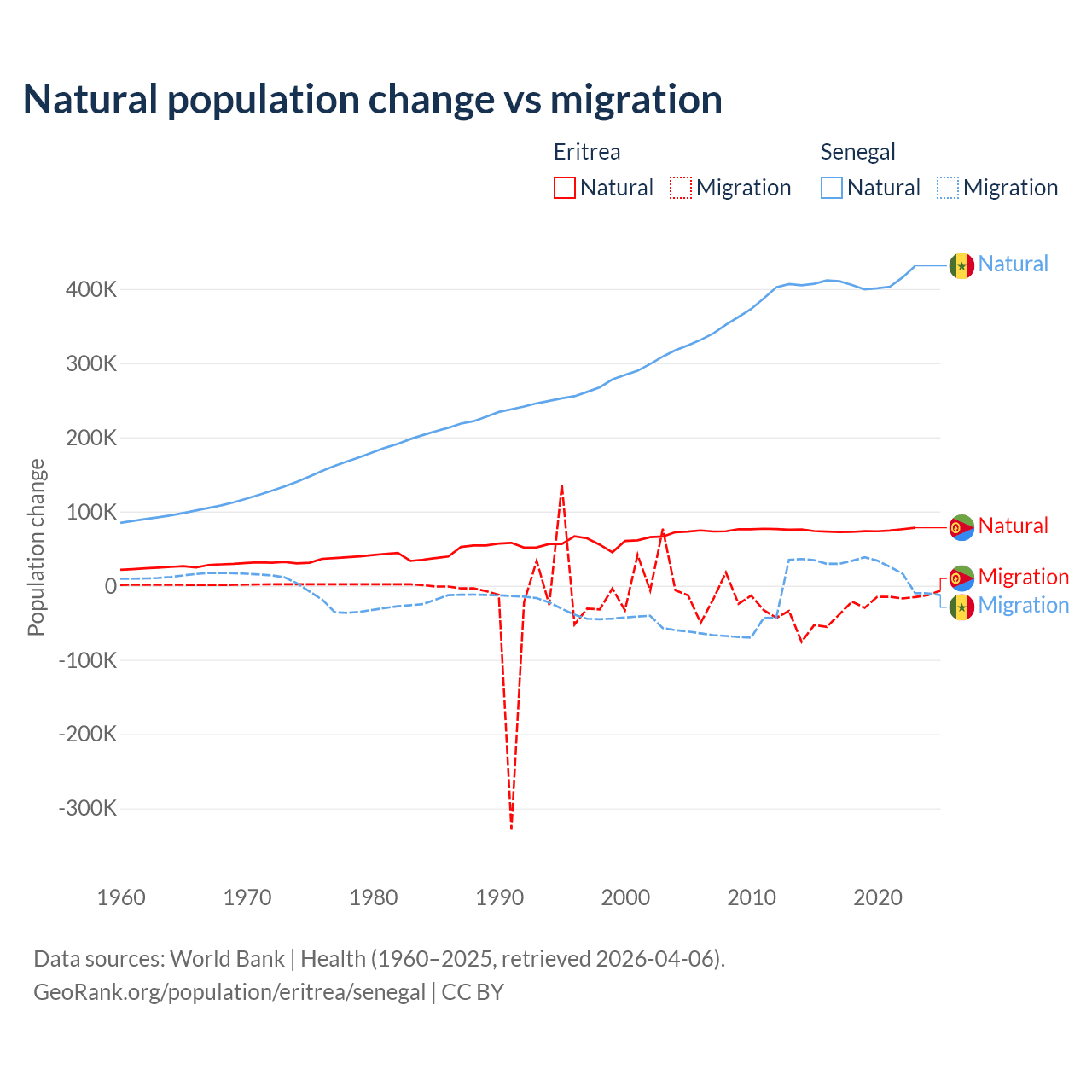 Over the last 10 years, 68.8% of the population change in Eritrea is from natural causes (a gain of 742,837 people) and 31.2% is from migration (a loss of 336,243 people). In Senegal 93.9% is from natural causes (a gain of 4,089,205 people) and 6.13% is from migration (a gain of 267,266 people).