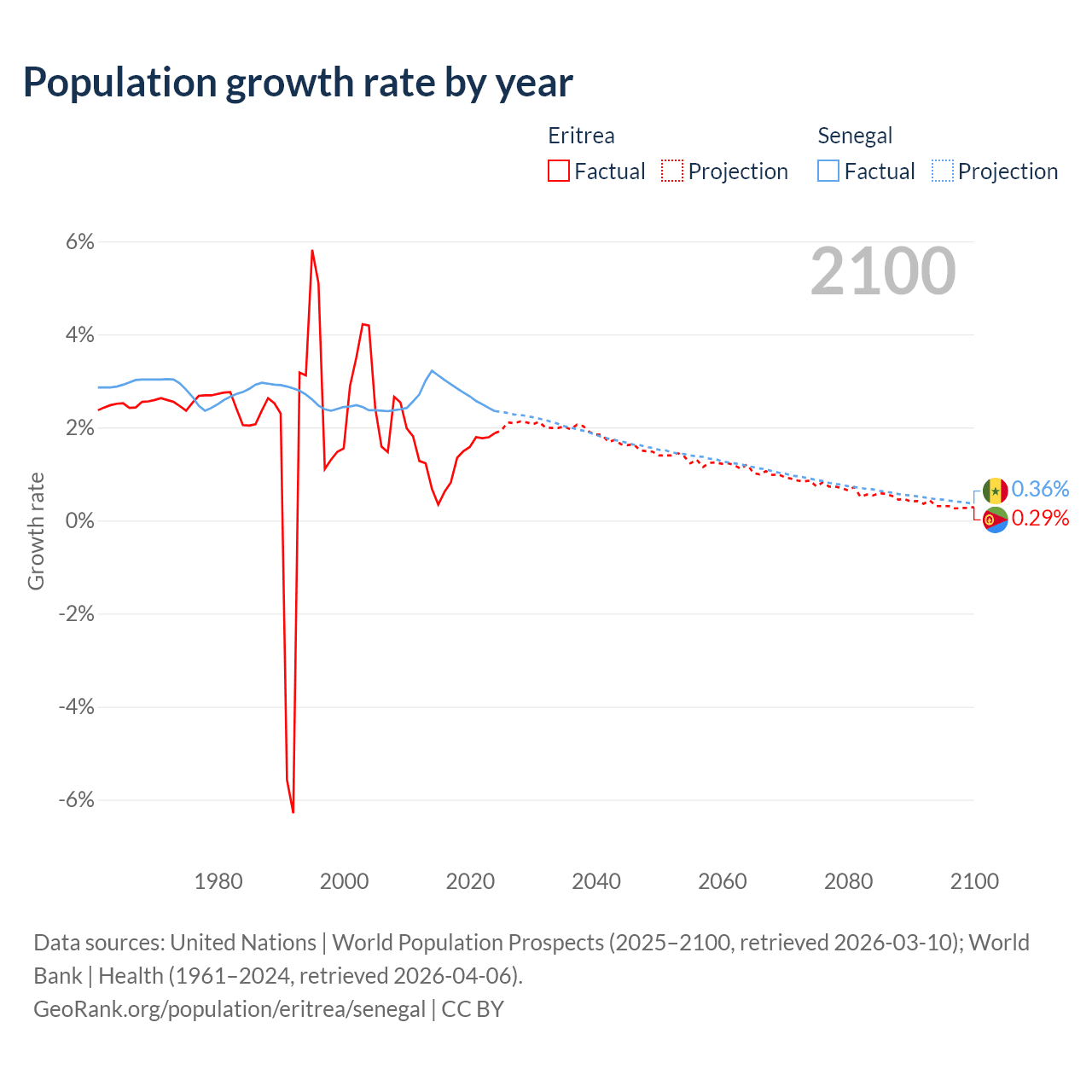 - For the last 10 years, Eritrea has had an average growth rate of +1.28% per year vs +2.76% in Senegal.