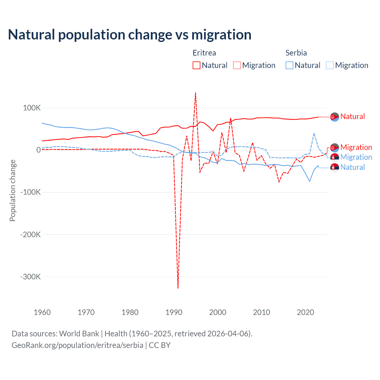 Over the last 10 years, 68.8% of the population change in Eritrea is from natural causes (a gain of 742,837 people) and 31.2% is from migration (a loss of 336,243 people). In Serbia 83.3% is from natural causes (a loss of 435,148 people) and 16.7% is from migration (a loss of 87,110 people).