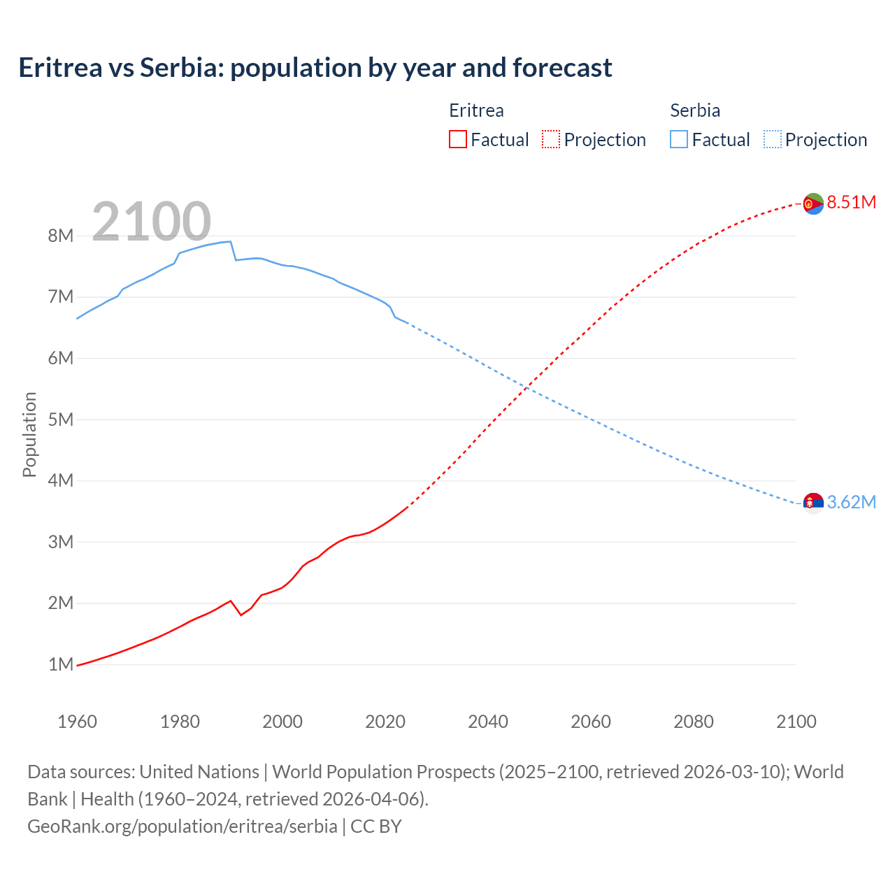 The latest officially reported population of Eritrea was 3,535,603 in 2024 vs 6,586,476 people in Serbia in 2024. In 2026, based on the adjusted UN estimation, the current Eritrea's population is 3,700,586 people compared to 6,494,521 in Serbia.