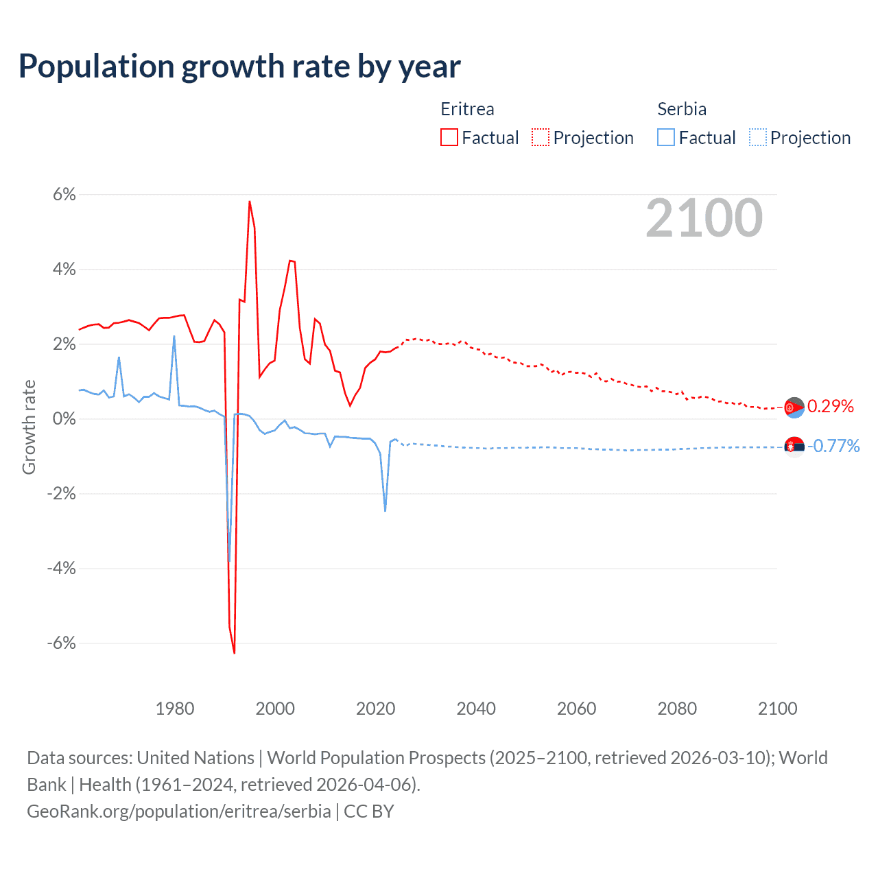 - For the last 10 years, Eritrea has had an average growth rate of +1.28% per year vs -0.76% in Serbia.
