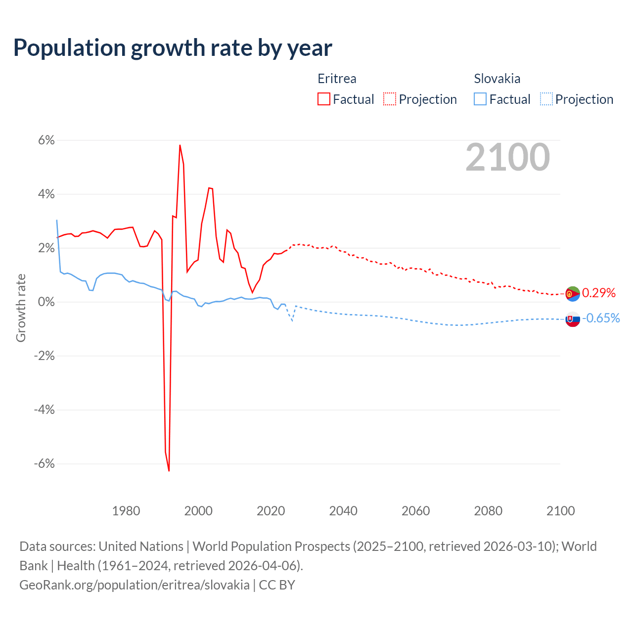 - For the last 10 years, Eritrea has had an average growth rate of +1.28% per year vs +0.01% in Slovakia.