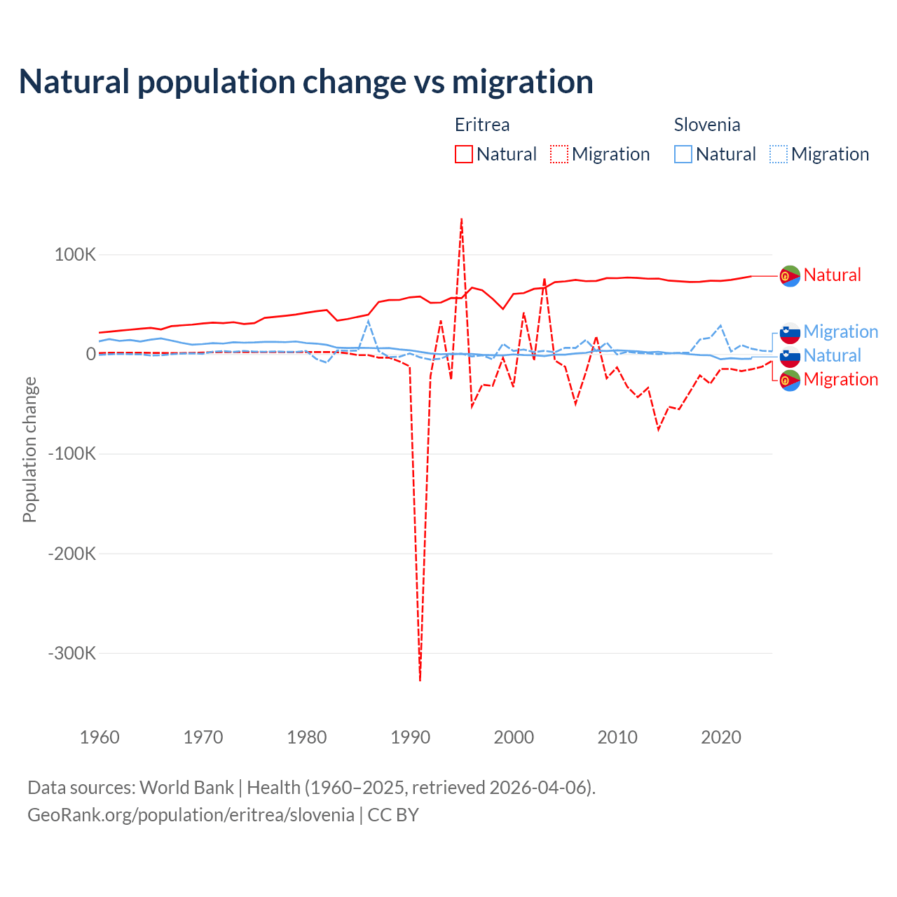 Over the last 10 years, 68.8% of the population change in Eritrea is from natural causes (a gain of 742,837 people) and 31.2% is from migration (a loss of 336,243 people). In Slovenia 18.1% is from natural causes (a loss of 17,573 people) and 81.9% is from migration (a gain of 79,532 people).