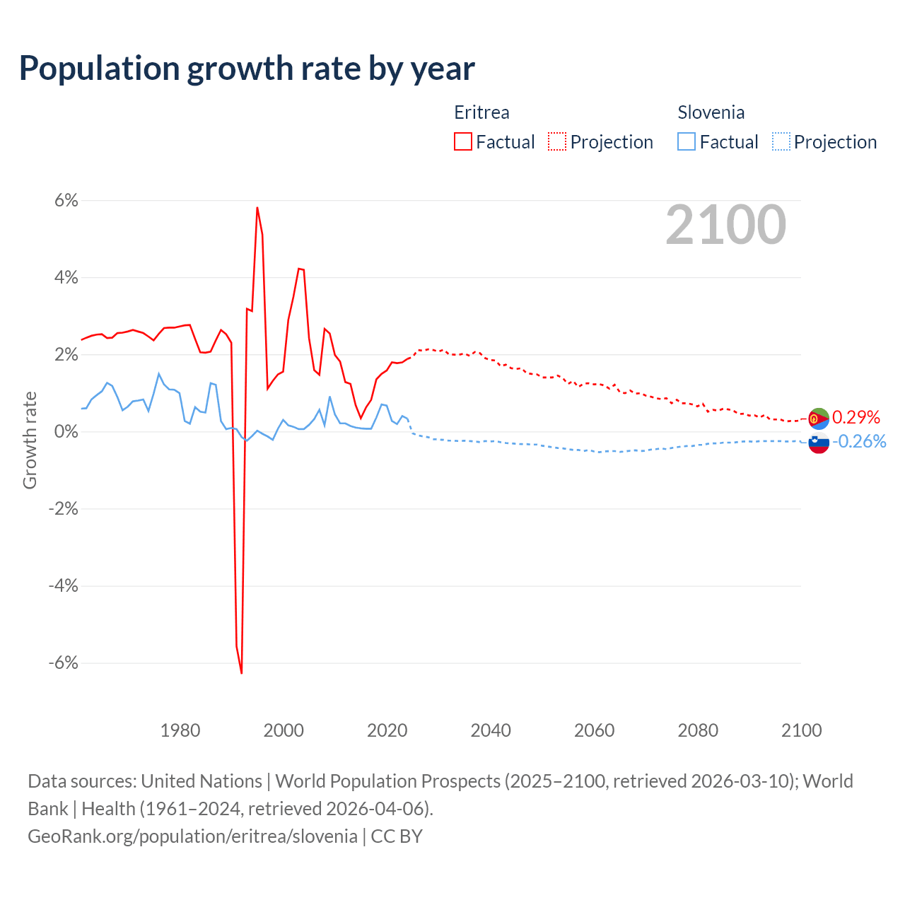 - For the last 10 years, Eritrea has had an average growth rate of +1.28% per year vs +0.29% in Slovenia.