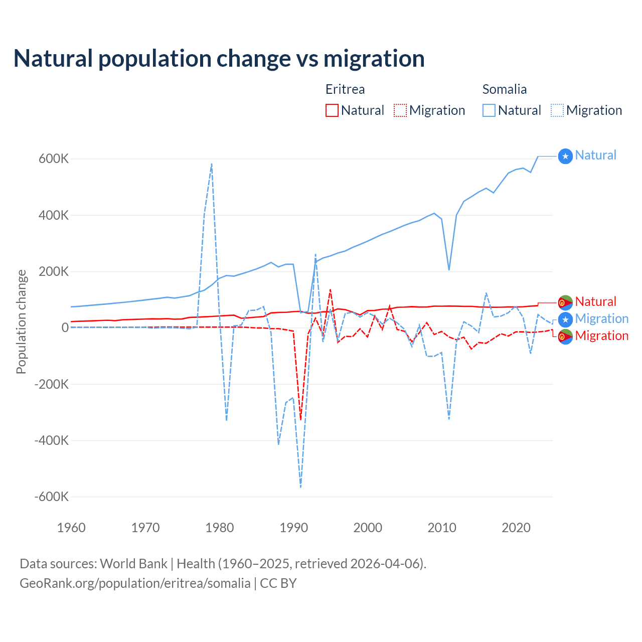 Over the last 10 years, 68.8% of the population change in Eritrea is from natural causes (a gain of 742,837 people) and 31.2% is from migration (a loss of 336,243 people). In Somalia 94.4% is from natural causes (a gain of 5,270,105 people) and 5.58% is from migration (a gain of 311,487 people).