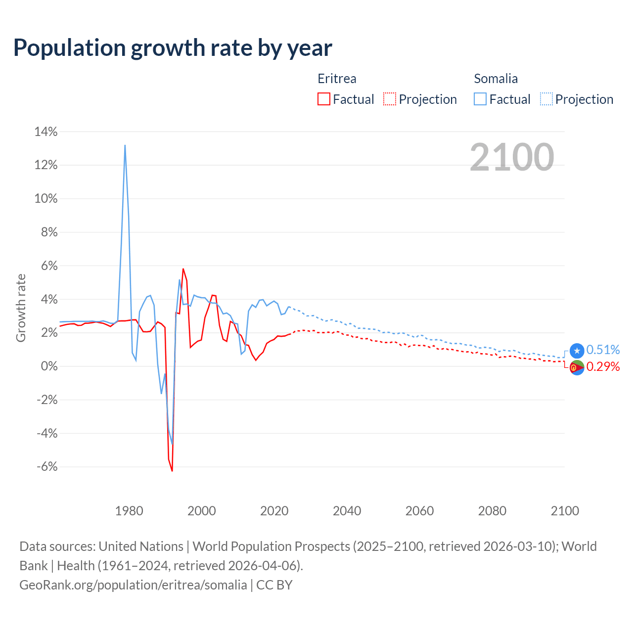 - For the last 10 years, Eritrea has had an average growth rate of +1.28% per year vs +3.61% in Somalia.