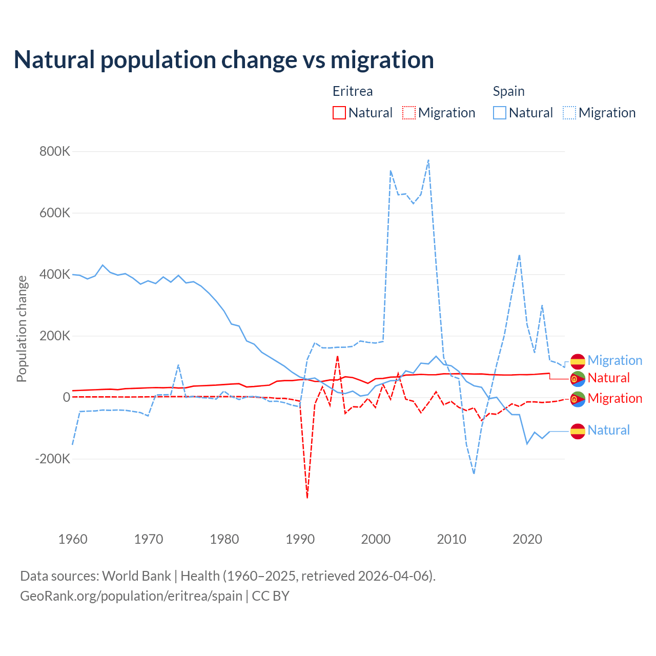 Over the last 10 years, 68.8% of the population change in Eritrea is from natural causes (a gain of 742,837 people) and 31.2% is from migration (a loss of 336,243 people). In Spain 25.8% is from natural causes (a loss of 627,829 people) and 74.2% is from migration (a gain of 1,810,127 people).