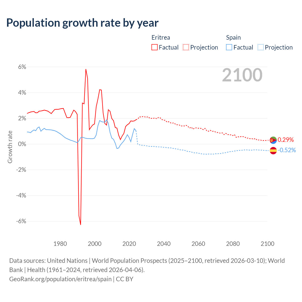 - For the last 10 years, Eritrea has had an average growth rate of +1.28% per year vs +0.43% in Spain.