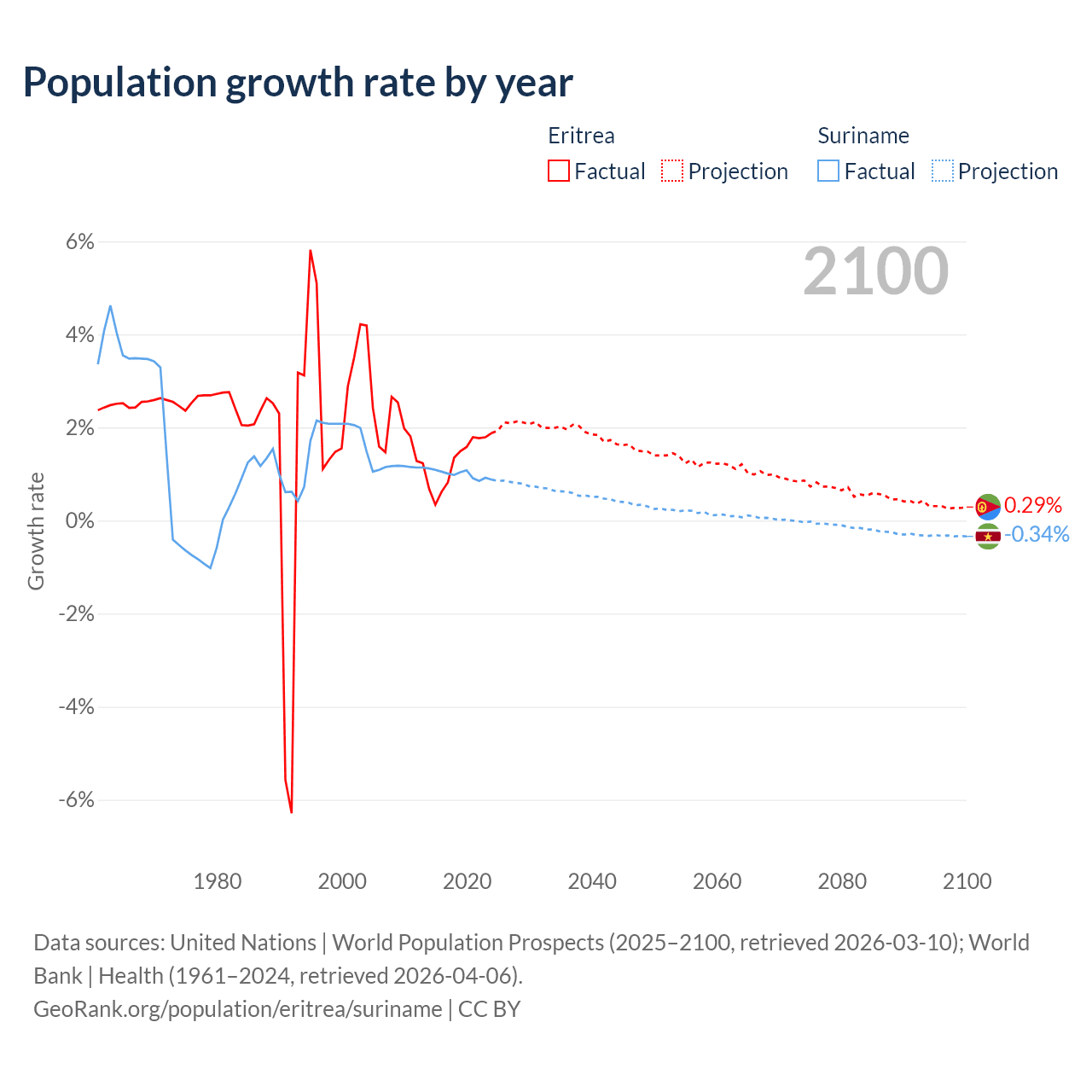 - For the last 10 years, Eritrea has had an average growth rate of +1.28% per year vs +0.99% in Suriname.