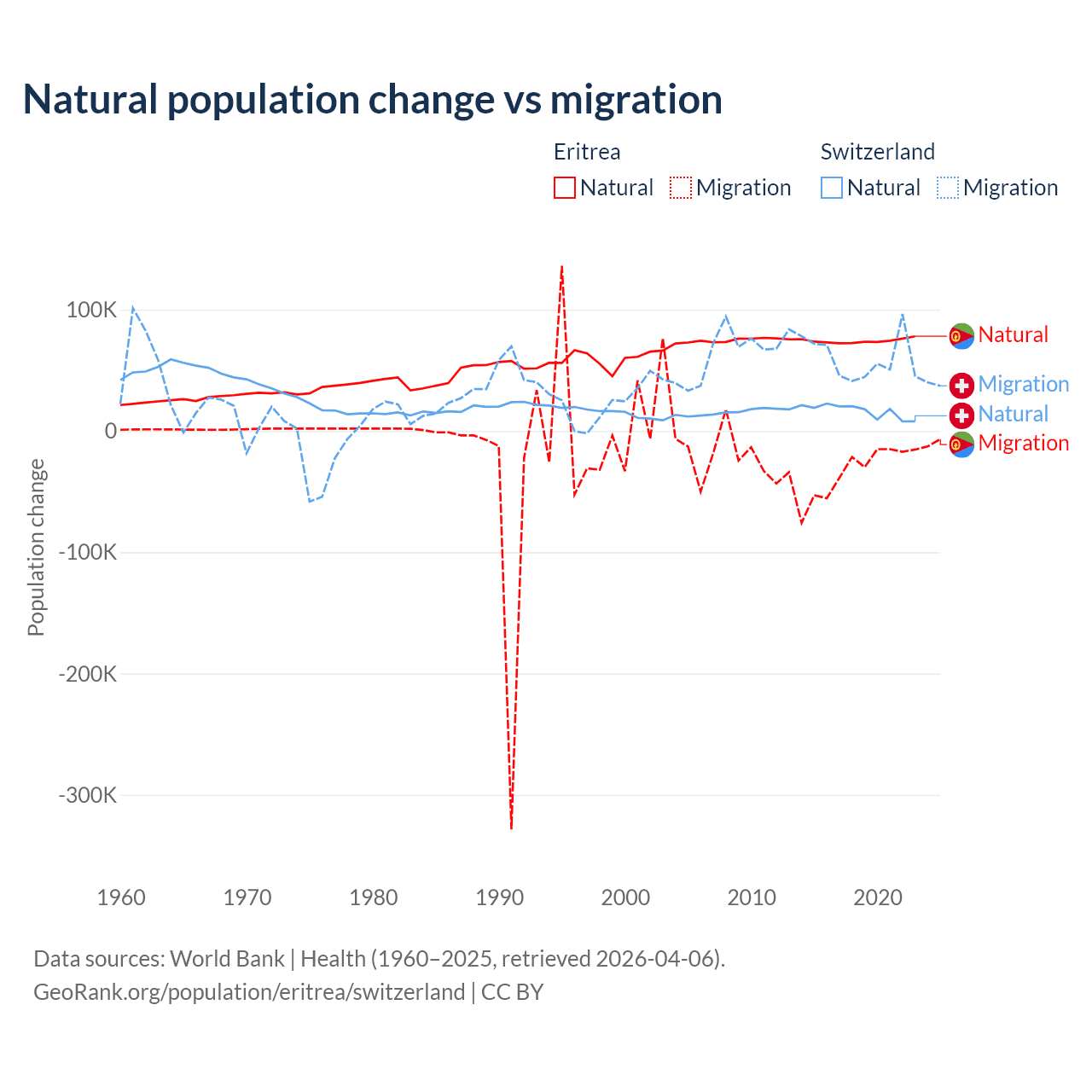 Over the last 10 years, 68.8% of the population change in Eritrea is from natural causes (a gain of 742,837 people) and 31.2% is from migration (a loss of 336,243 people). In Switzerland 21.6% is from natural causes (a gain of 165,354 people) and 78.4% is from migration (a gain of 600,145 people).