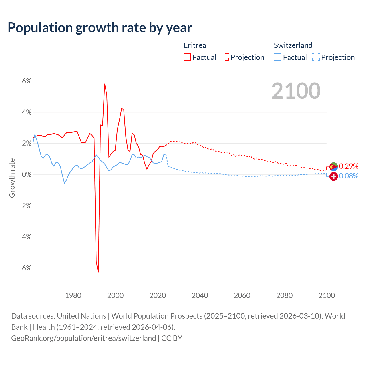 - For the last 10 years, Eritrea has had an average growth rate of +1.28% per year vs +0.98% in Switzerland.