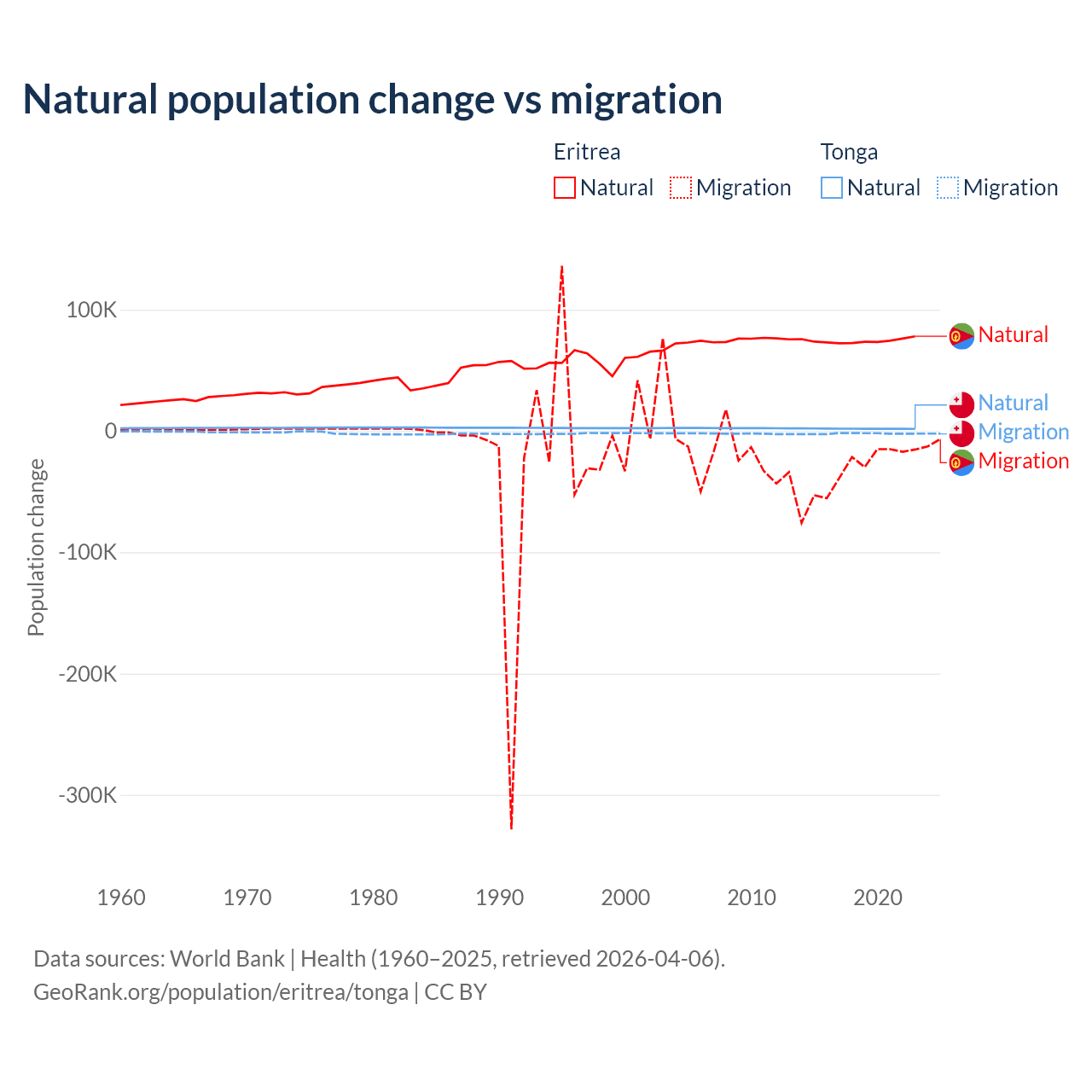 Over the last 10 years, 68.8% of the population change in Eritrea is from natural causes (a gain of 742,837 people) and 31.2% is from migration (a loss of 336,243 people). In Tonga 46.9% is from natural causes (a gain of 18,919 people) and 53.1% is from migration (a loss of 21,384 people).