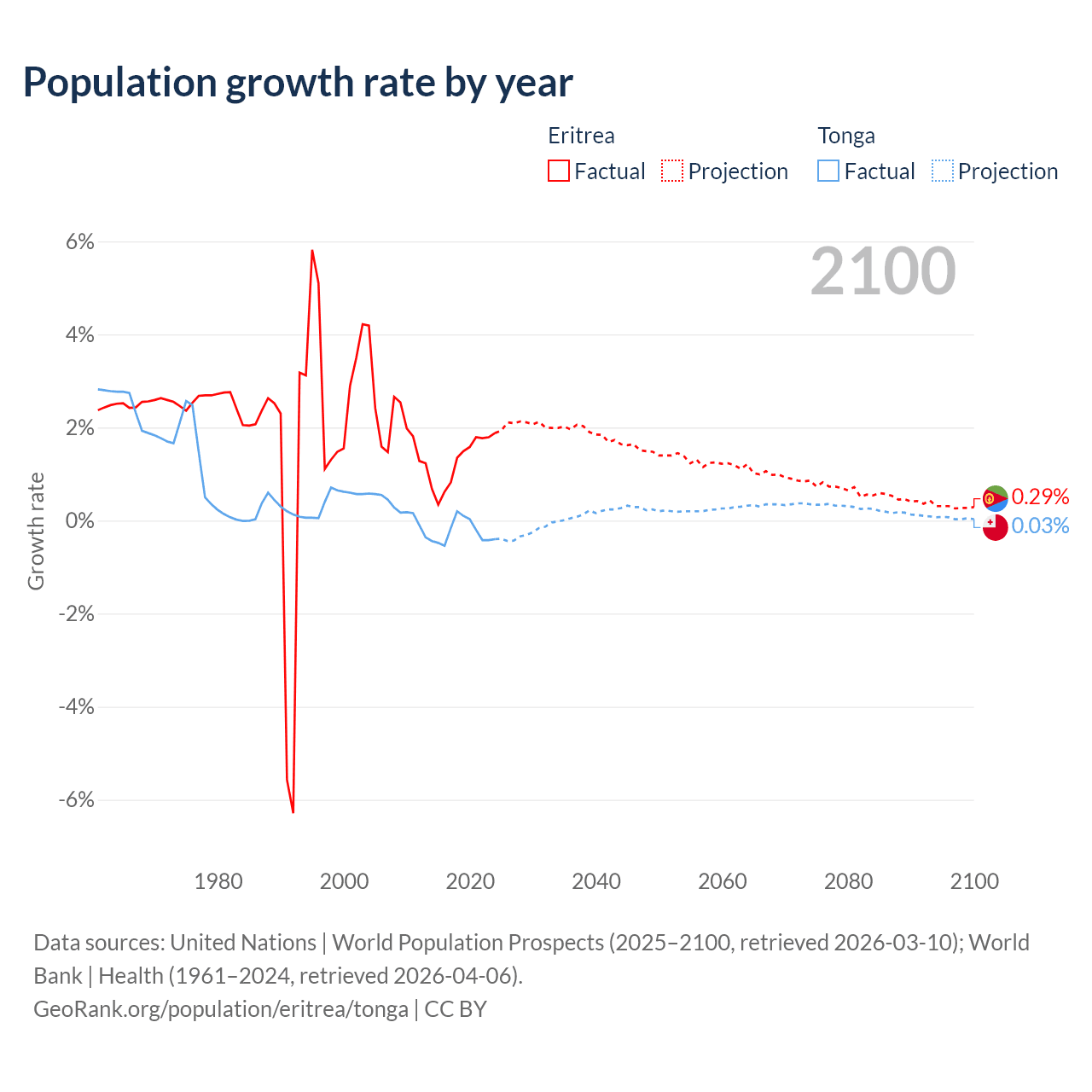 - For the last 10 years, Eritrea has had an average growth rate of +1.28% per year vs -0.25% in Tonga.