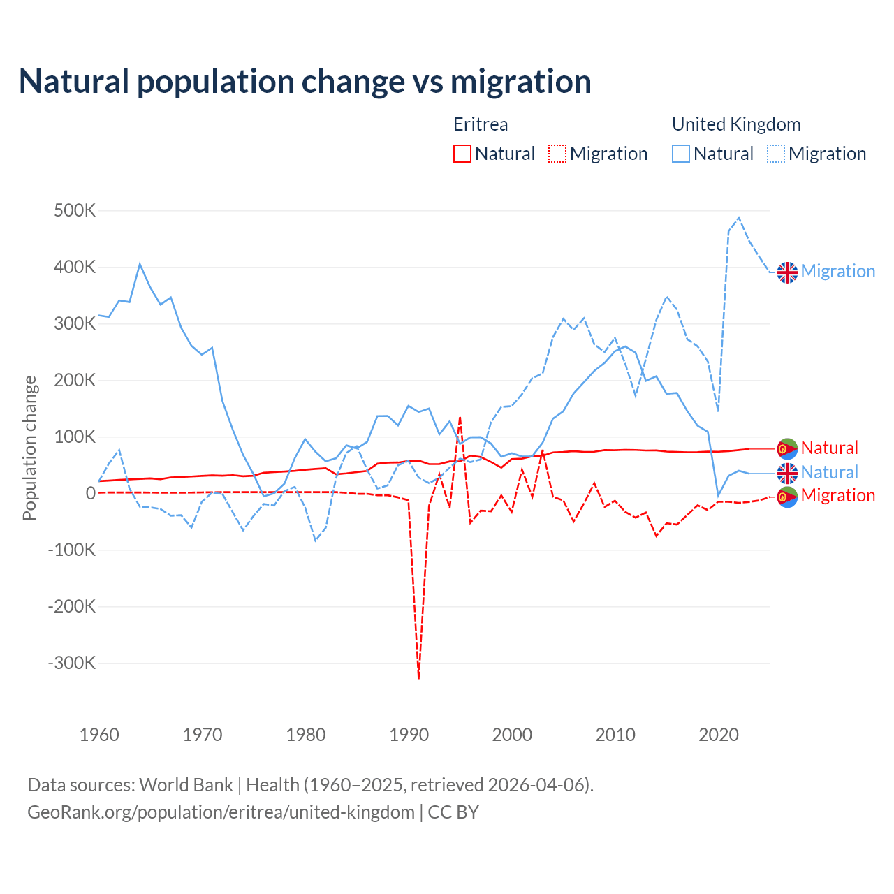 Over the last 10 years, 68.8% of the population change in Eritrea is from natural causes (a gain of 742,837 people) and 31.2% is from migration (a loss of 336,243 people). In the United Kingdom 23.9% is from natural causes (a gain of 1,033,129 people) and 76.1% is from migration (a gain of 3,283,101 people).