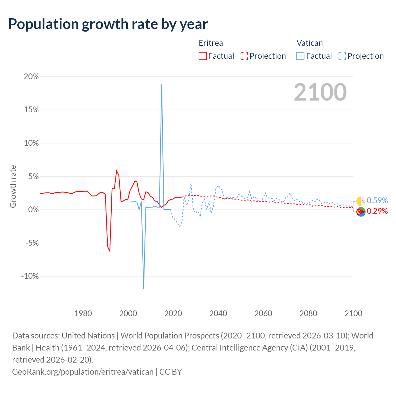- For the last 10 years, Eritrea has had an average growth rate of +1.28% per year vs +1.9% in the Vatican.