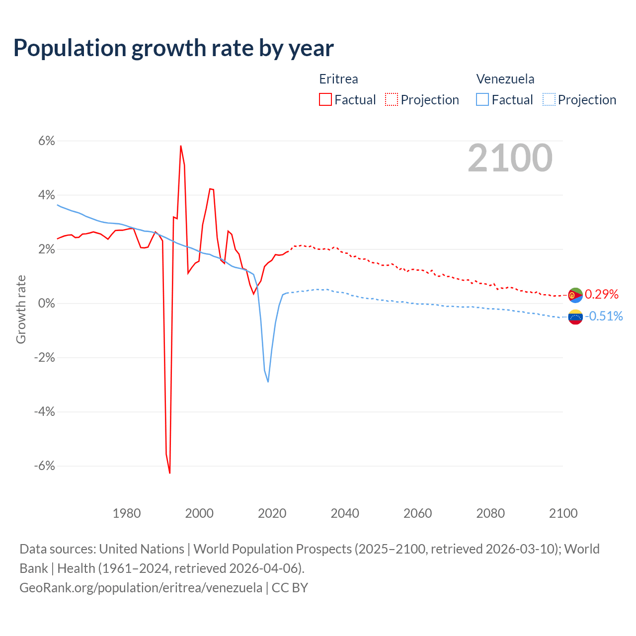 - For the last 10 years, Eritrea has had an average growth rate of +1.28% per year vs -0.46% in Venezuela.