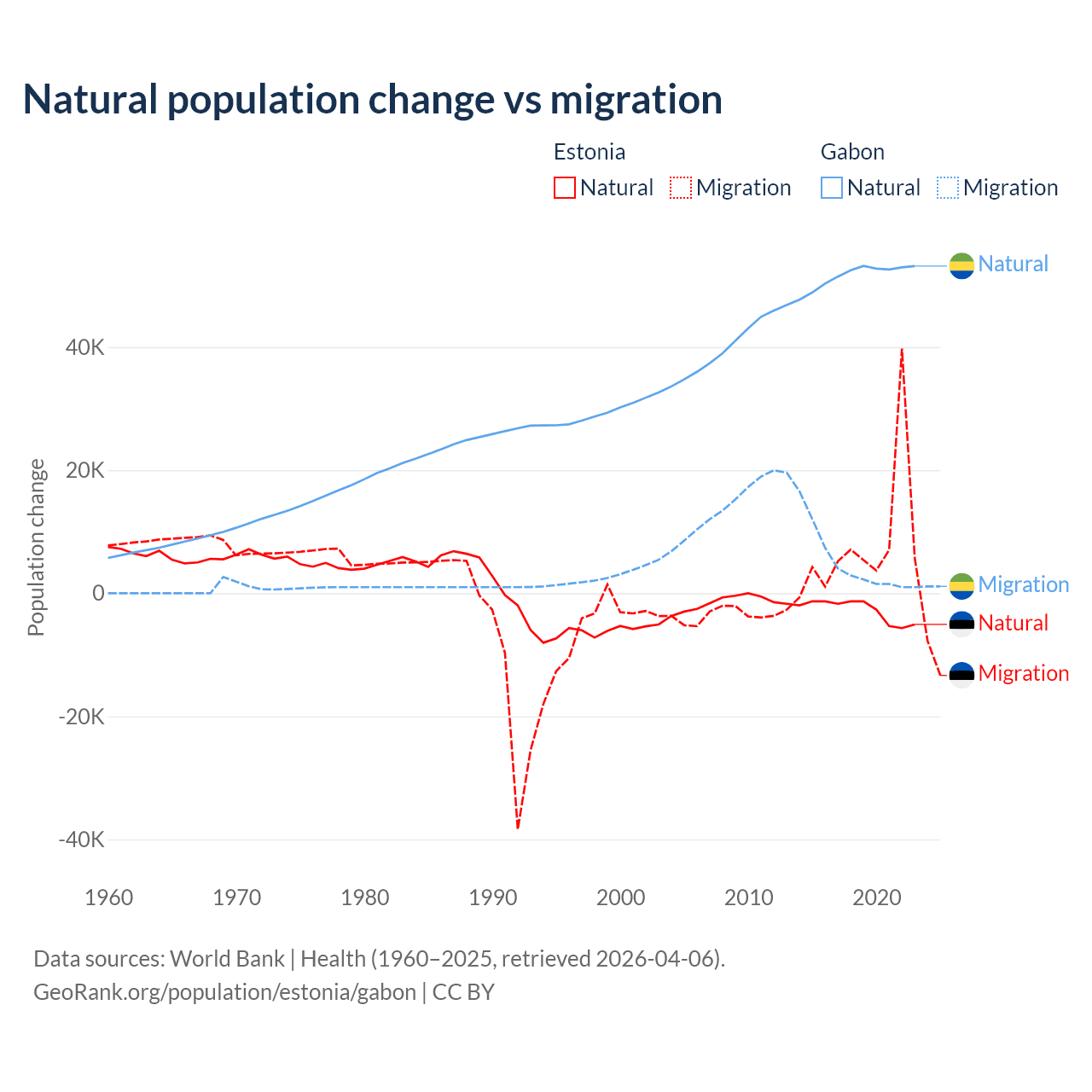 Over the last 10 years, 26.1% of the population change in Estonia is from natural causes (a loss of 27,683 people) and 73.9% is from migration (a gain of 78,553 people). In Gabon 91.1% is from natural causes (a gain of 515,484 people) and 8.86% is from migration (a gain of 50,119 people).