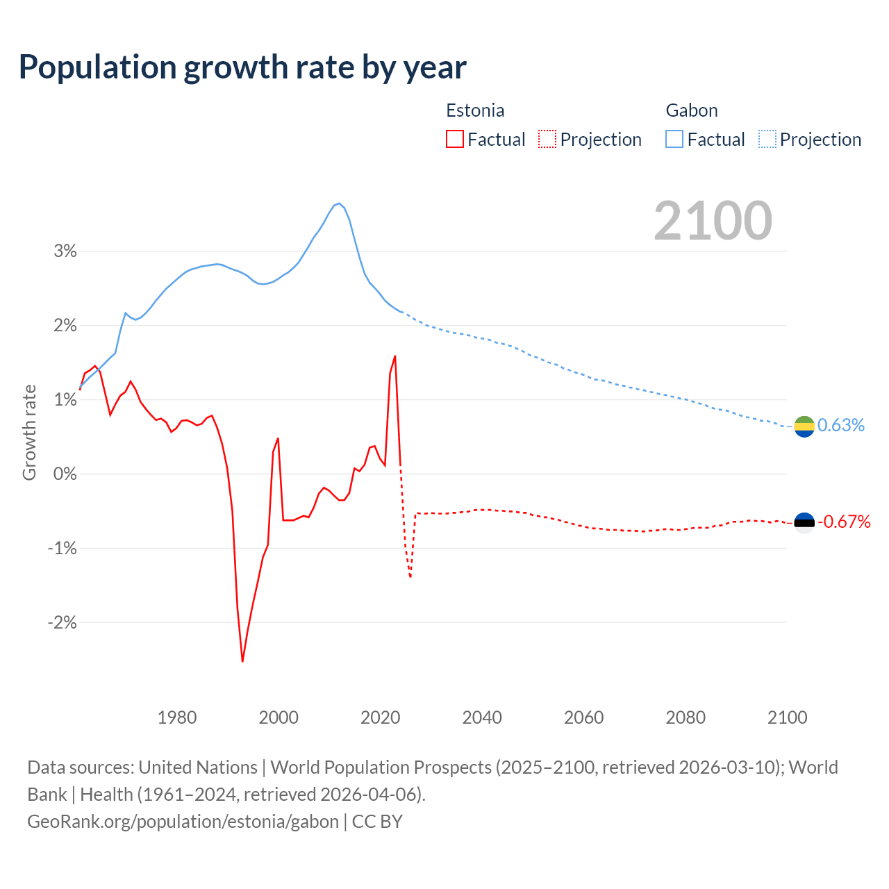 - For the last 10 years, Estonia has had an average growth rate of +0.37% per year vs +2.61% in Gabon.