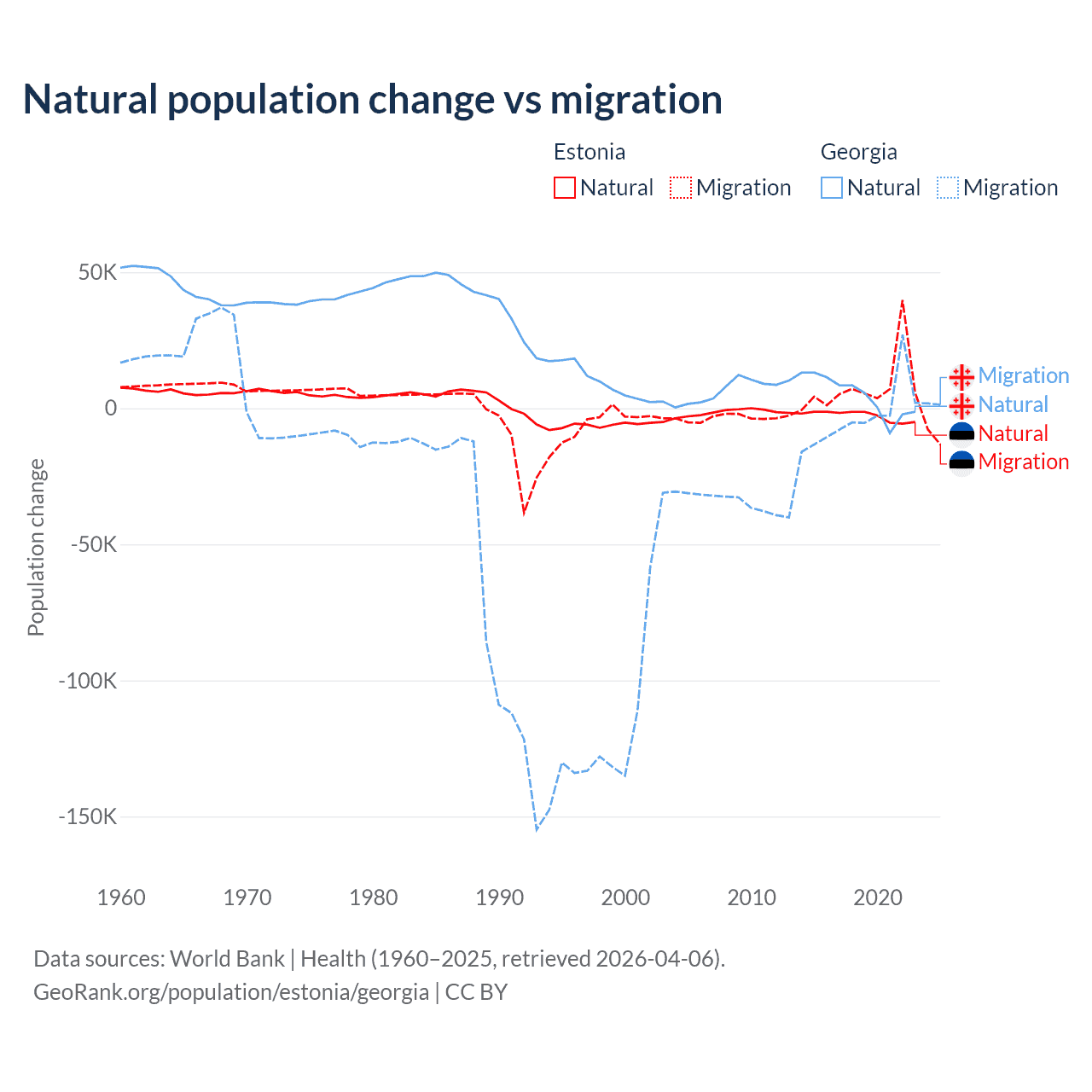 Over the last 10 years, 26.1% of the population change in Estonia is from natural causes (a loss of 27,683 people) and 73.9% is from migration (a gain of 78,553 people). In Georgia 57.7% is from natural causes (a gain of 47,646 people) and 42.3% is from migration (a loss of 34,907 people).