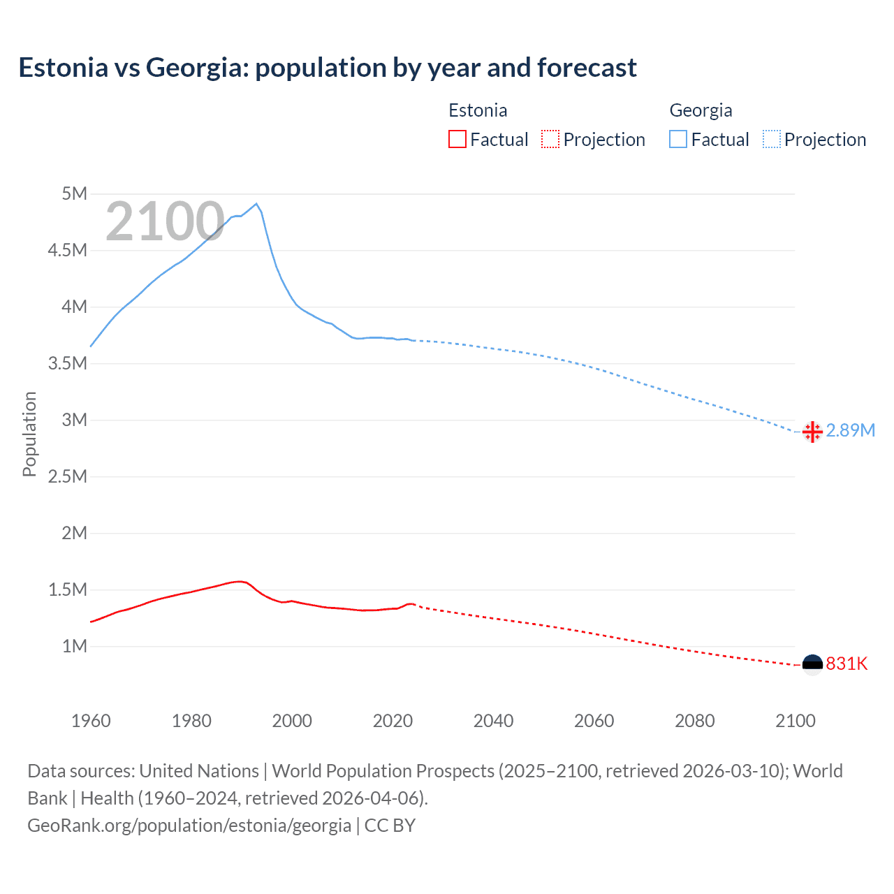 Estonia vs Georgia: population by year and forecast