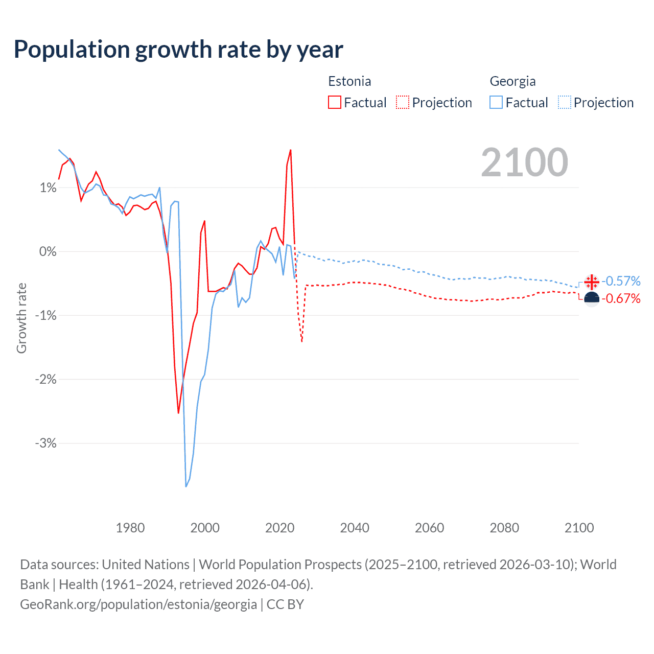 - For the last 10 years, Estonia has had an average growth rate of +0.37% per year vs -0.04% in Georgia.