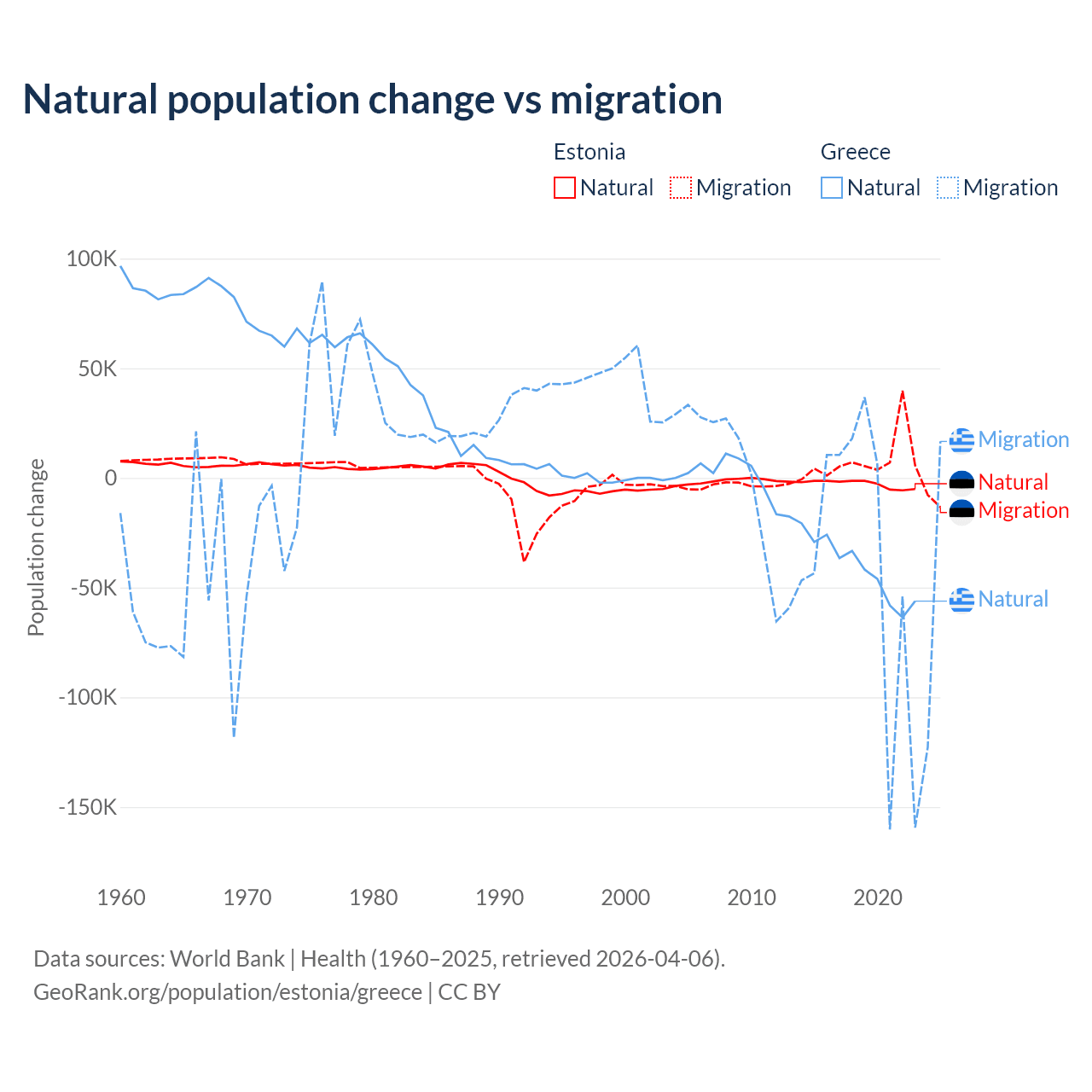 Over the last 10 years, 26.1% of the population change in Estonia is from natural causes (a loss of 27,683 people) and 73.9% is from migration (a gain of 78,553 people). In Greece 51.9% is from natural causes (a loss of 411,426 people) and 48.1% is from migration (a loss of 381,824 people).