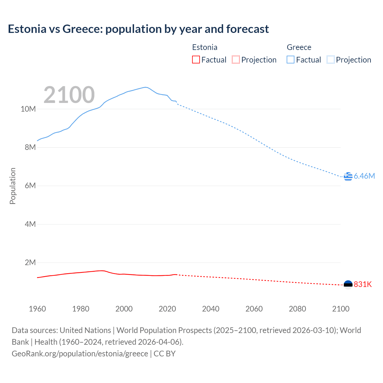 Estonia vs Greece: population by year and forecast