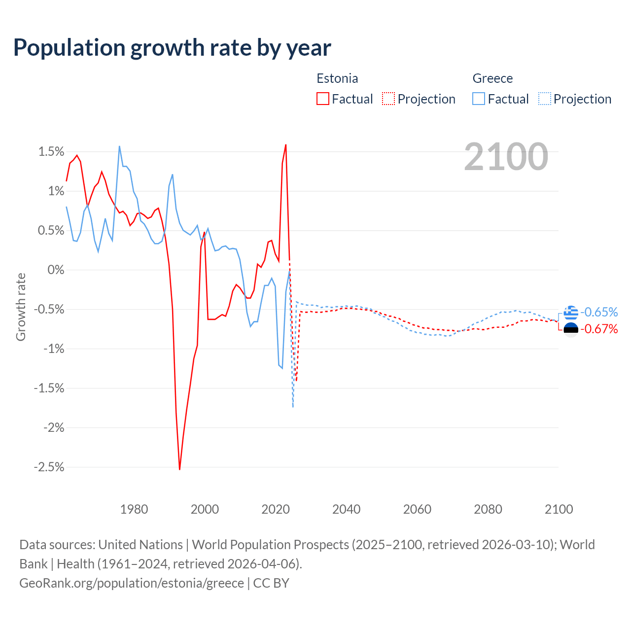 - For the last 10 years, Estonia has had an average growth rate of +0.37% per year vs -0.47% in Greece.