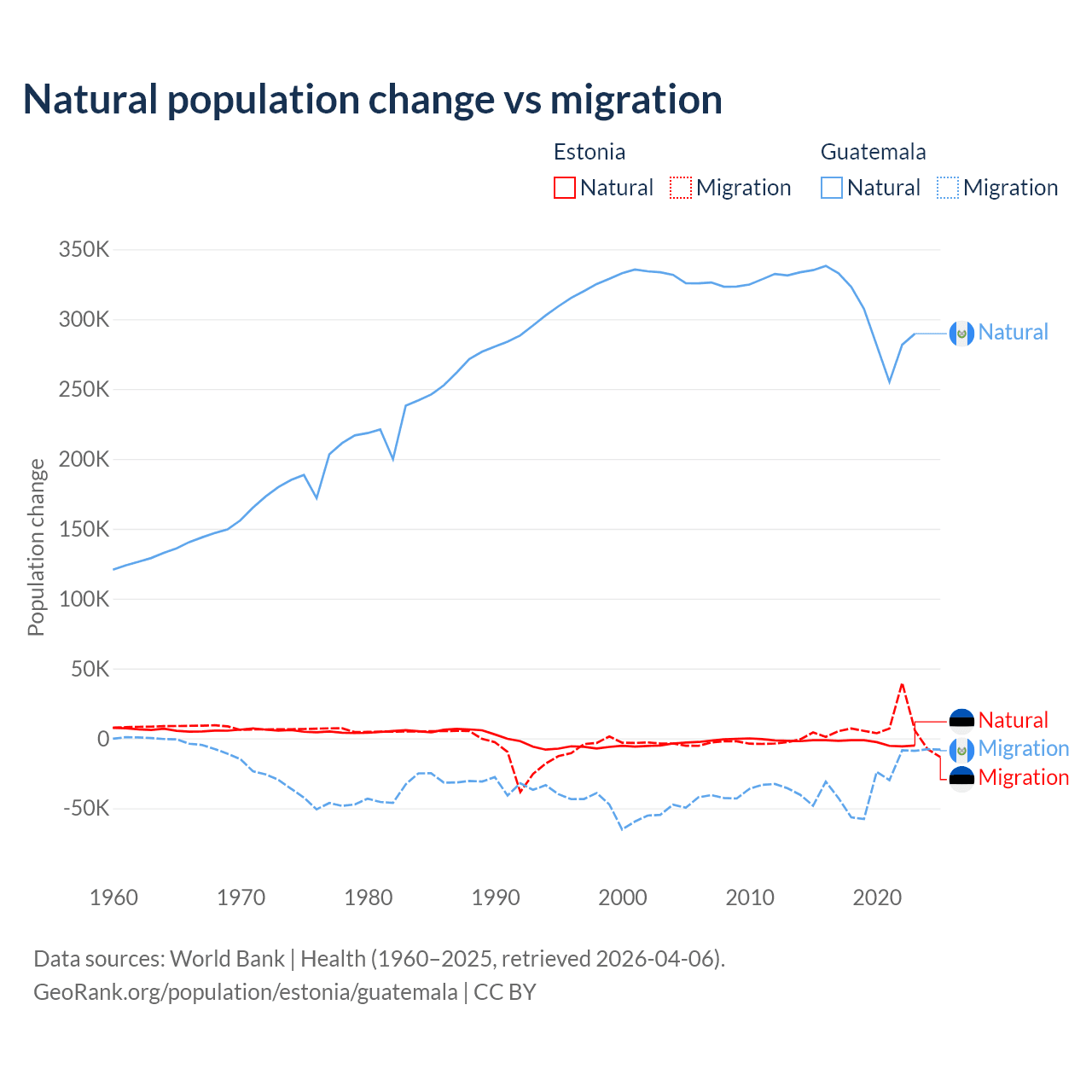 Over the last 10 years, 26.1% of the population change in Estonia is from natural causes (a loss of 27,683 people) and 73.9% is from migration (a gain of 78,553 people). In Guatemala 89.8% is from natural causes (a gain of 3,077,847 people) and 10.2% is from migration (a loss of 347,818 people).