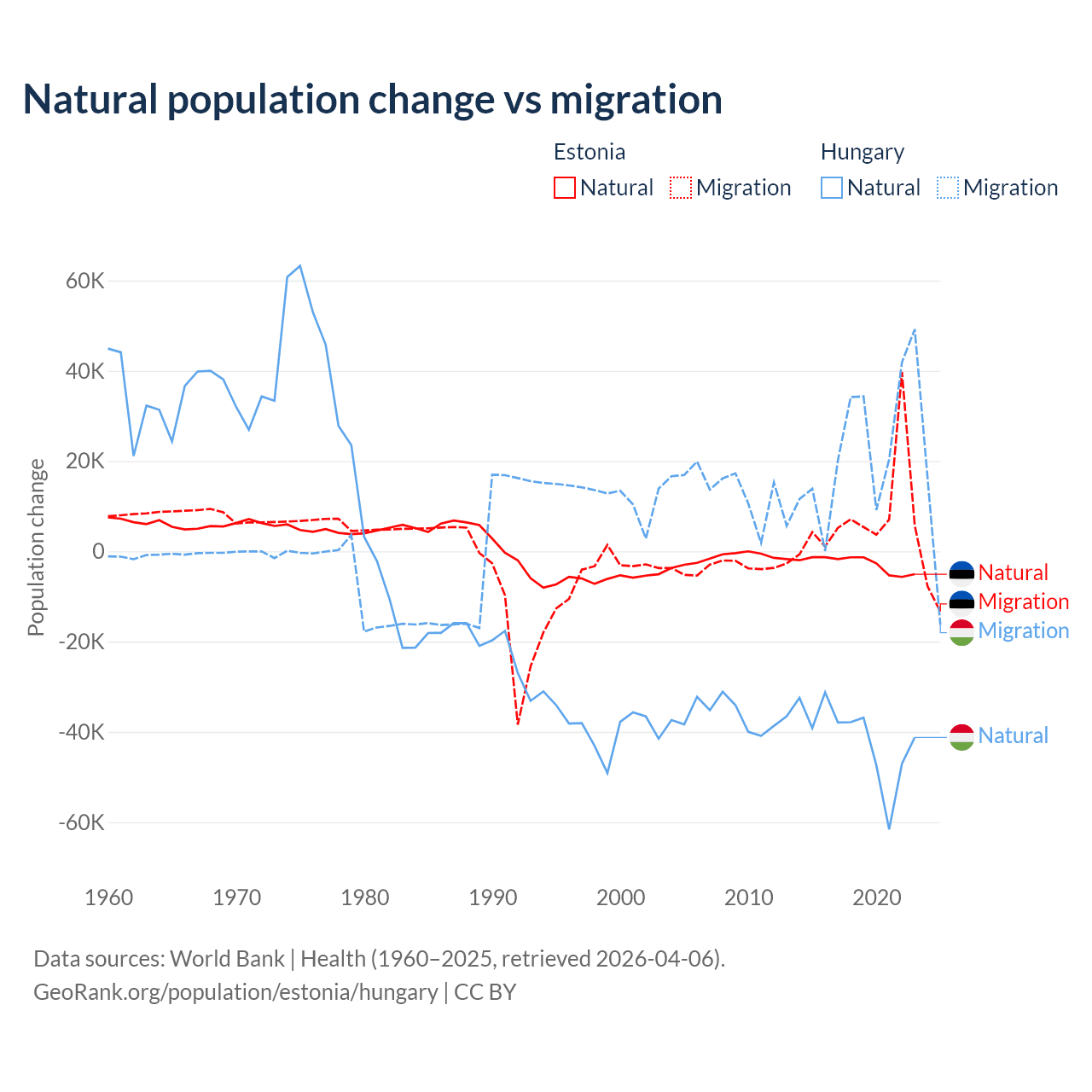 Over the last 10 years, 26.1% of the population change in Estonia is from natural causes (a loss of 27,683 people) and 73.9% is from migration (a gain of 78,553 people). In Hungary 63.7% is from natural causes (a loss of 412,838 people) and 36.3% is from migration (a gain of 234,837 people).