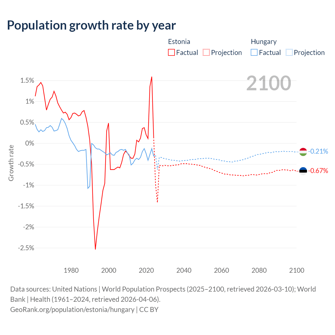 - For the last 10 years, Estonia has had an average growth rate of +0.37% per year vs -0.29% in Hungary.