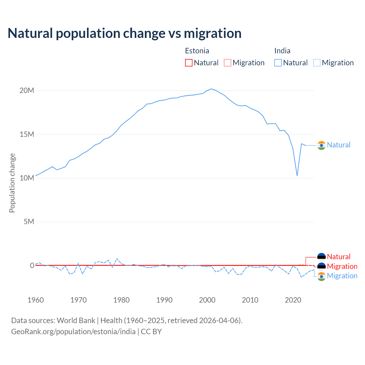 Over the last 10 years, 26.1% of the population change in Estonia is from natural causes (a loss of 27,683 people) and 73.9% is from migration (a gain of 78,553 people). In India 96.4% is from natural causes (a gain of 145,503,378 people) and 3.56% is from migration (a loss of 5,376,884 people).