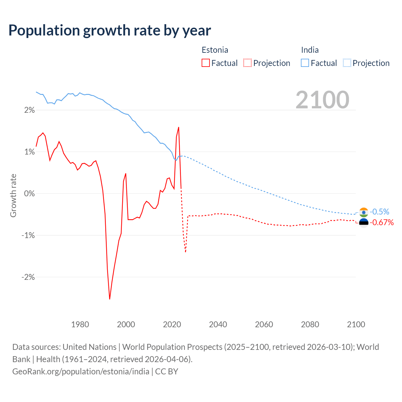 - For the last 10 years, Estonia has had an average growth rate of +0.37% per year vs +1.03% in India.